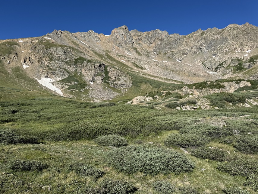 And now to downclimb the grassy ledge. Once again, I stayed on the tundra until I reached the rock rib, then headed for the saddle to the right.