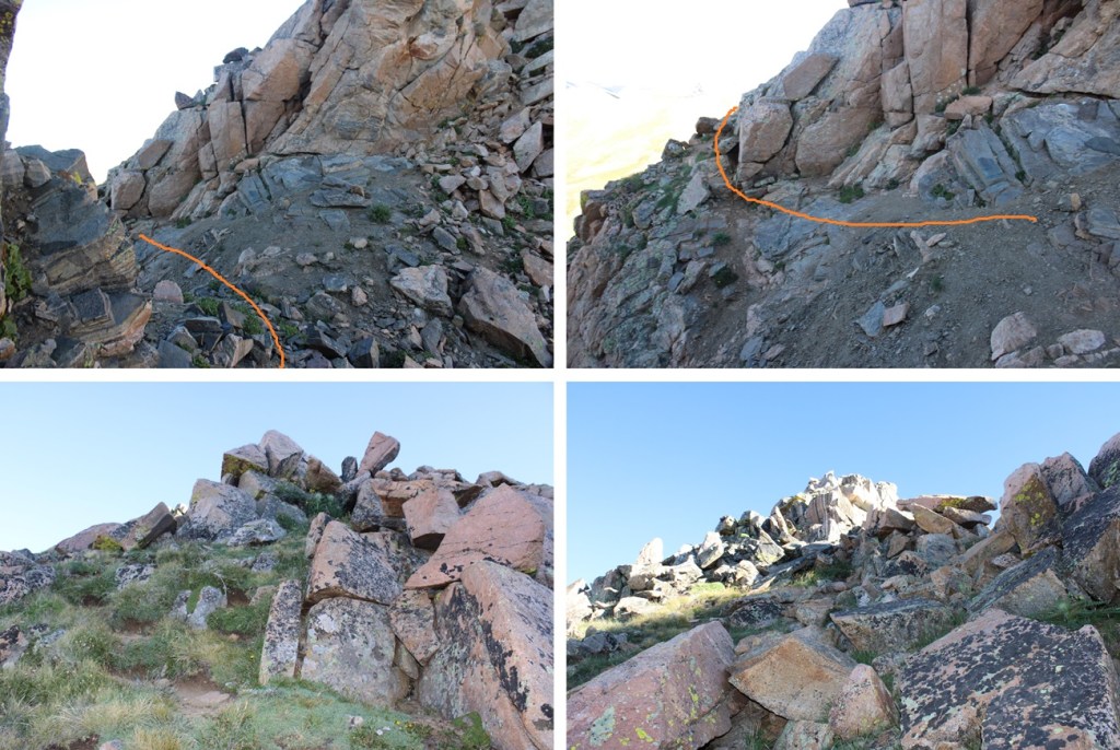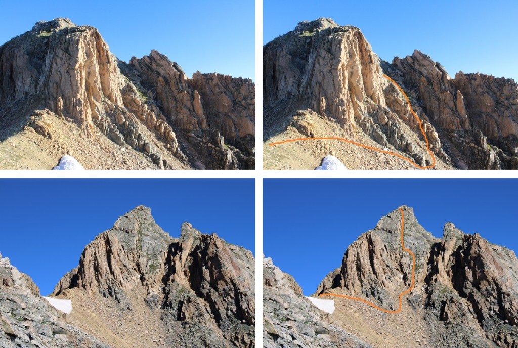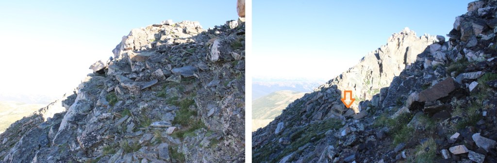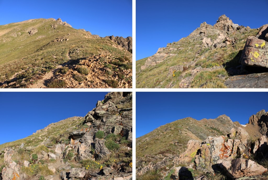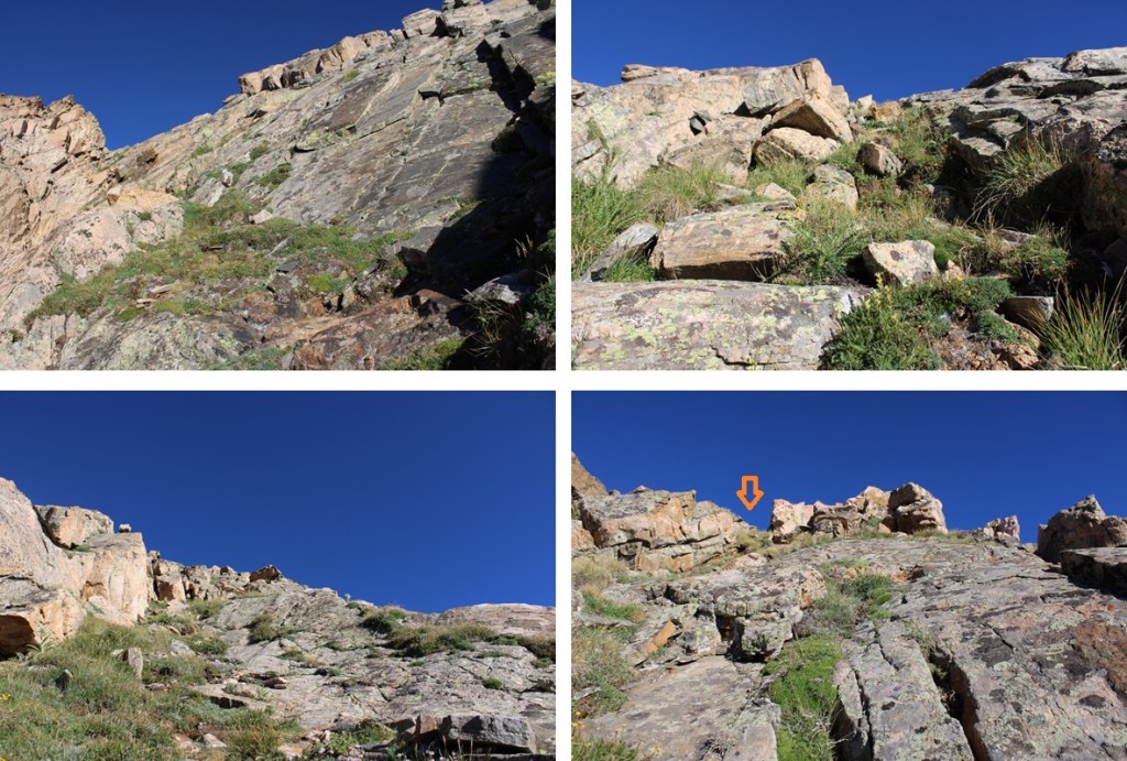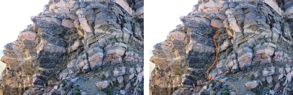 If you haven’t already, now is a good time to put on your helmet. From the saddle, head northeast and look for a solid band of rock. This rock band is important, because the gullies are miserable. Once on the rock band, ascend towards the tundra, then follow the line of tundra northeast. Once you’re on the tundra, you can stay on tundra until the top. This is class 3, and a slip would have you falling quite a ways, like hundreds of feet before you stop, so take care in this area. Here’s a visual representation of how I climbed from two different angles. It’s probably a good idea to start memorizing the route as you’re hiking up the ridge from the saddle of The Citadel and PT 12671.