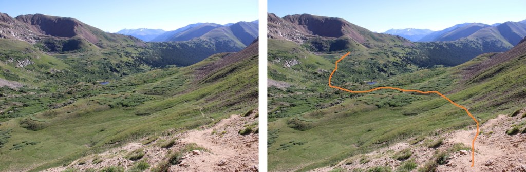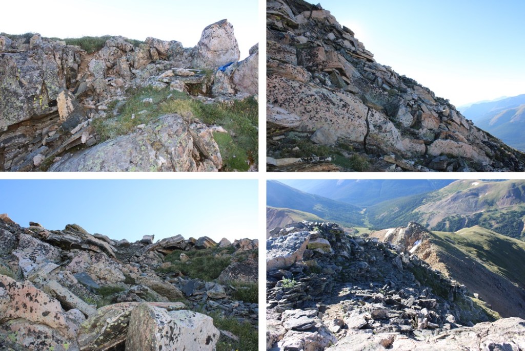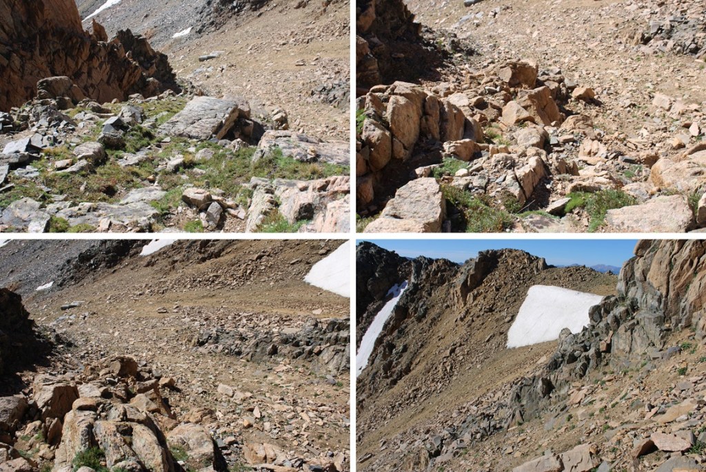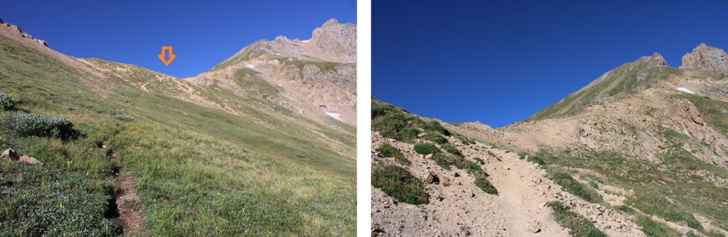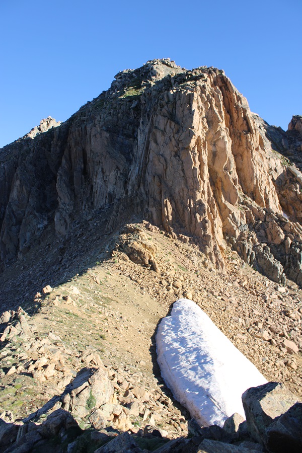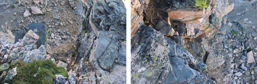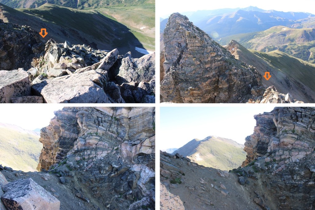 If you haven’t already, now is a good time to put on your helmet. From the saddle, head northeast and look for a solid band of rock. This rock band is important, because the gullies are miserable. Once on the rock band, ascend towards the tundra, then follow the line of tundra northeast. Once you’re on the tundra, you can stay on tundra until the top. This is class 3, and a slip would have you falling quite a ways, like hundreds of feet before you stop, so take care in this area. Here’s a visual representation of how I climbed from two different angles. It’s probably a good idea to start memorizing the route as you’re hiking up the ridge from the saddle of The Citadel and PT 12671.