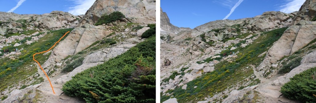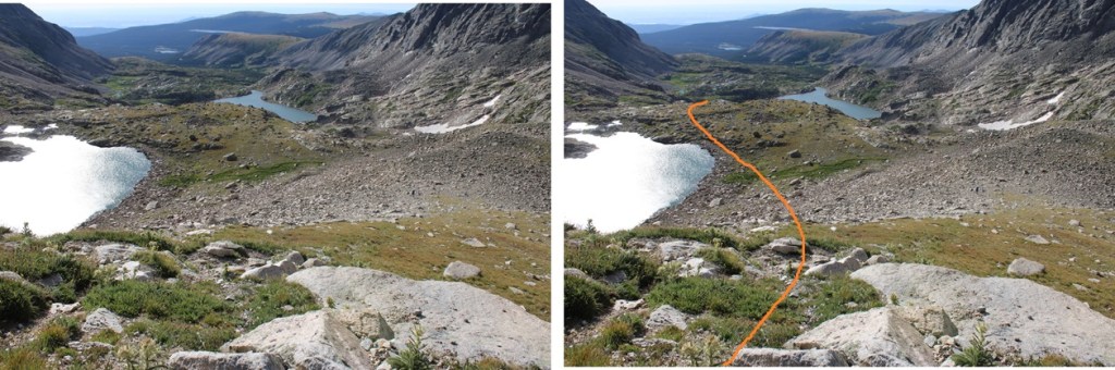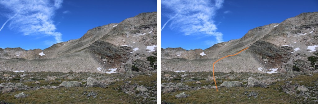 I aimed for the drainage, then followed it south towards Blue Lake and the trail below