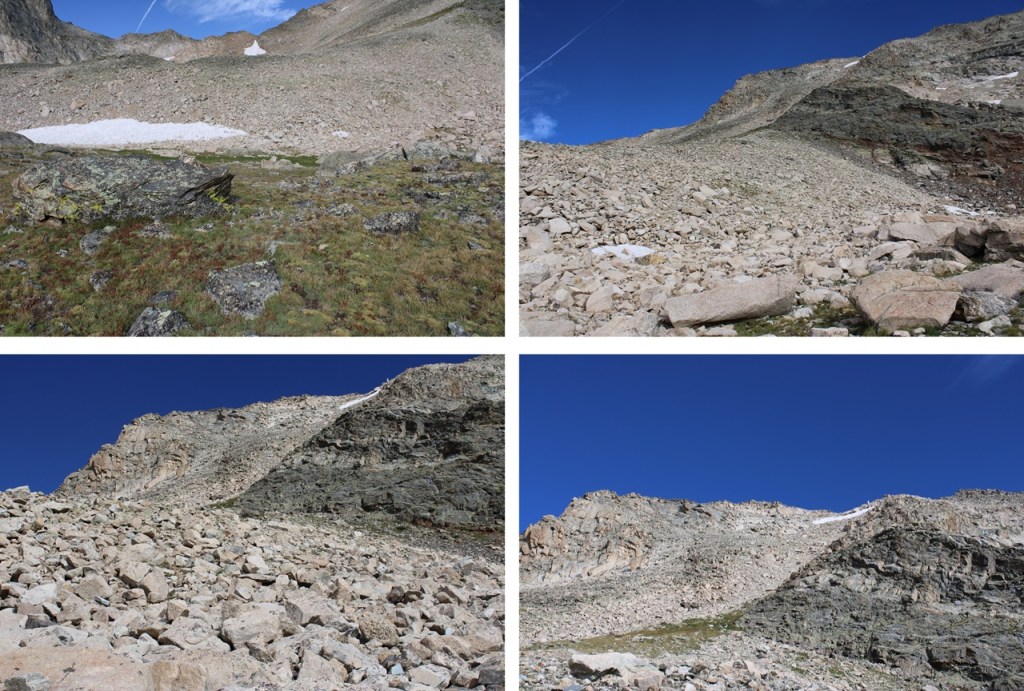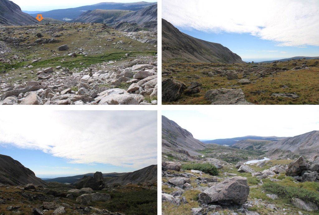 And now to head up the gully. I did this by heading north, staying to the right of the snow. If there isn’t snow when you’re doing this route, you can aim for a rather large vertical rock sticking up straight (you’ll know it when you see it, as it stands out). This gully had game trails leading to the top, and I’m sure you could take them all the way to the top of the gully. However, I stayed to the right of the snow and then climbed up the rocky rib. This was mostly class 2, with a few easy class 3 moves thrown in.