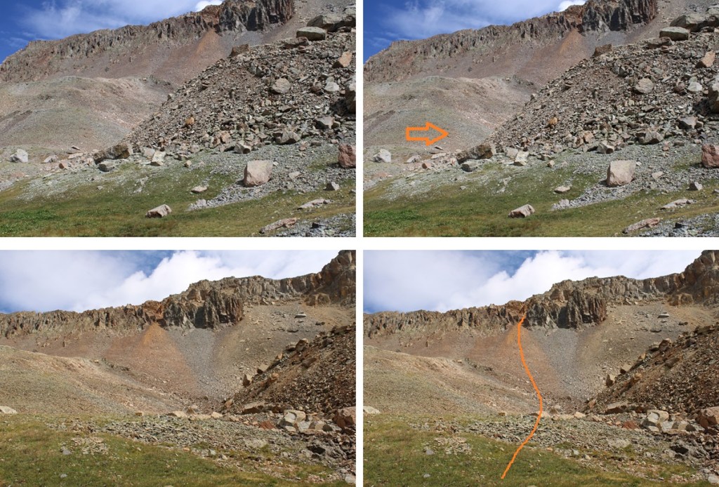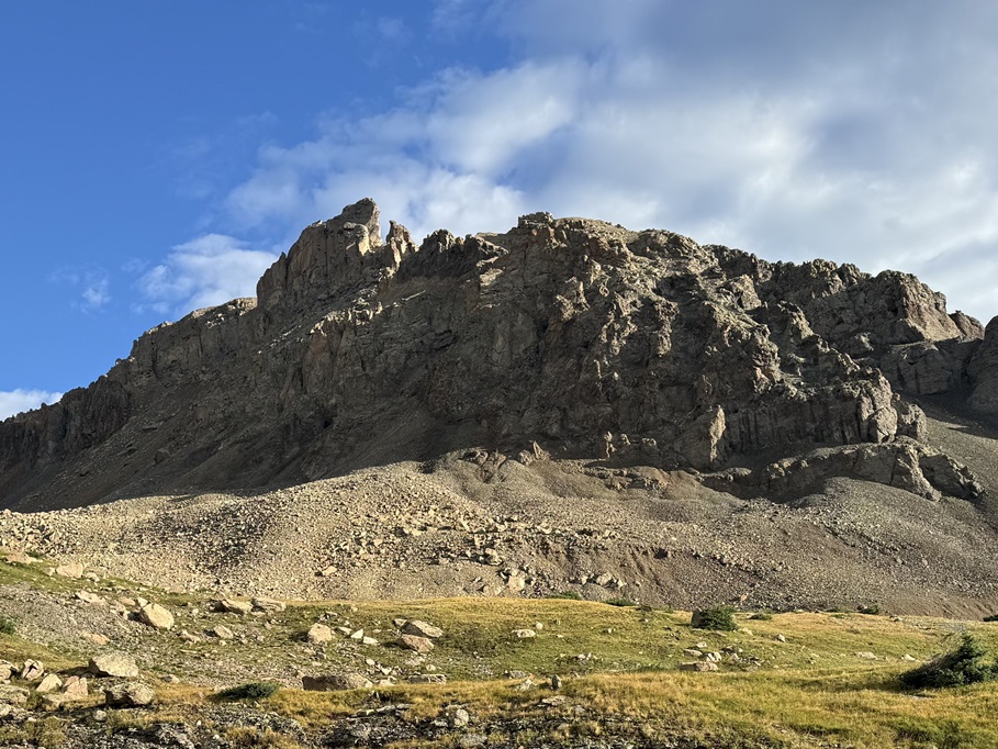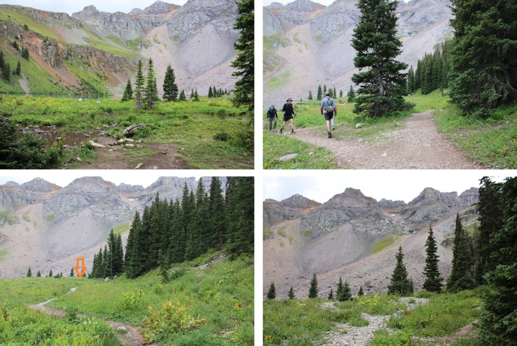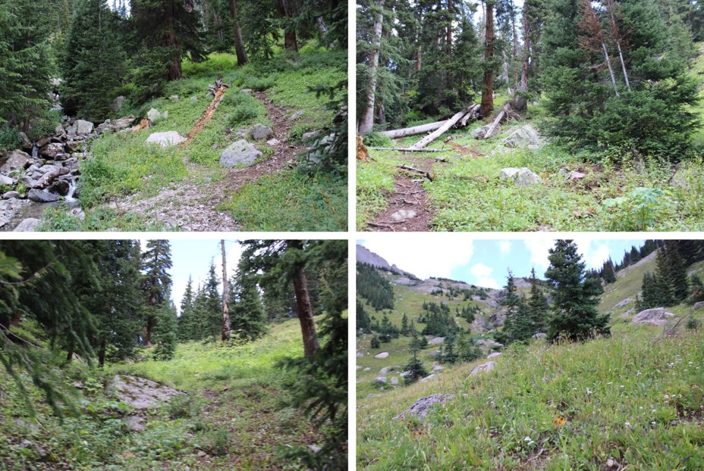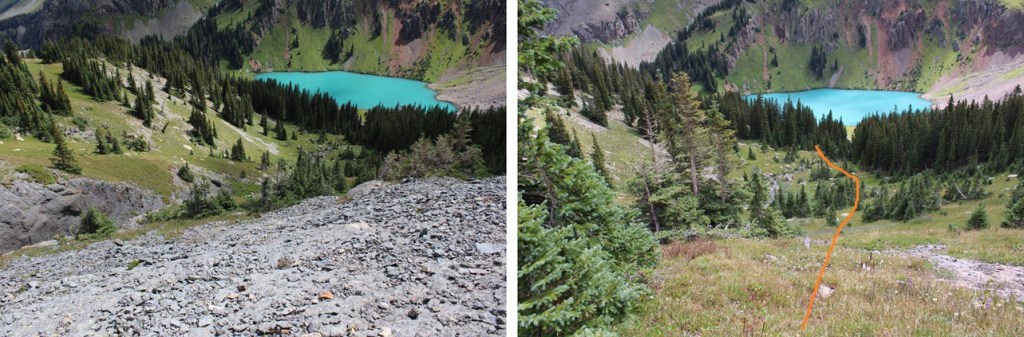 At about 12330’, I went right and dropped about 50 feet down to the talus. There is a game trail here on the talus that will bring you to the upper basin.