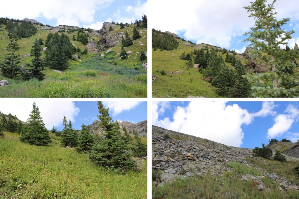 Once at treeline, or at least very close in a wide open space, I crossed the creek and headed west up the slope, keeping the creek to my right.
