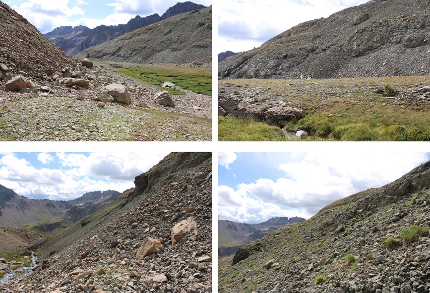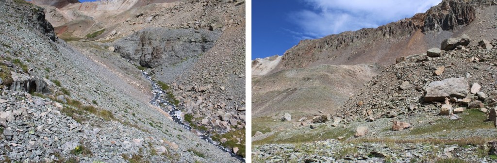 Once in the rocky basin, I stayed to the right of the creek and descended on the talus to the tundra towards Blue Lakes.