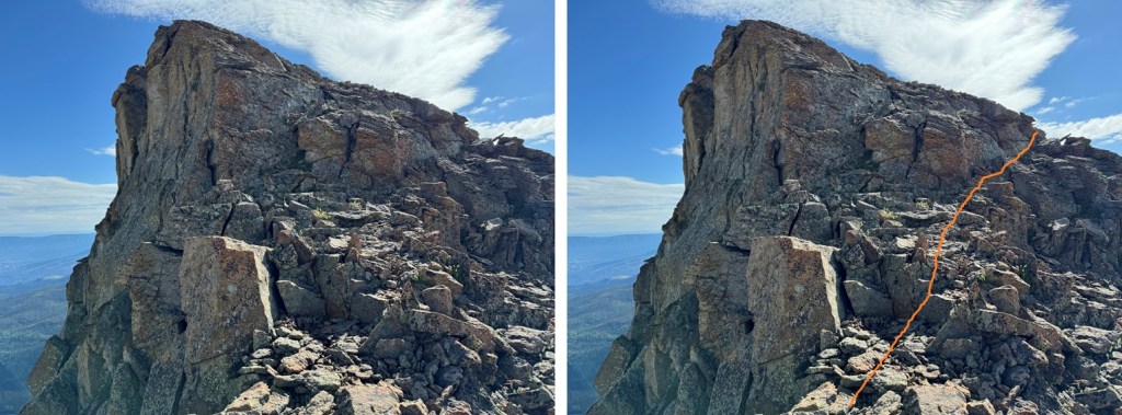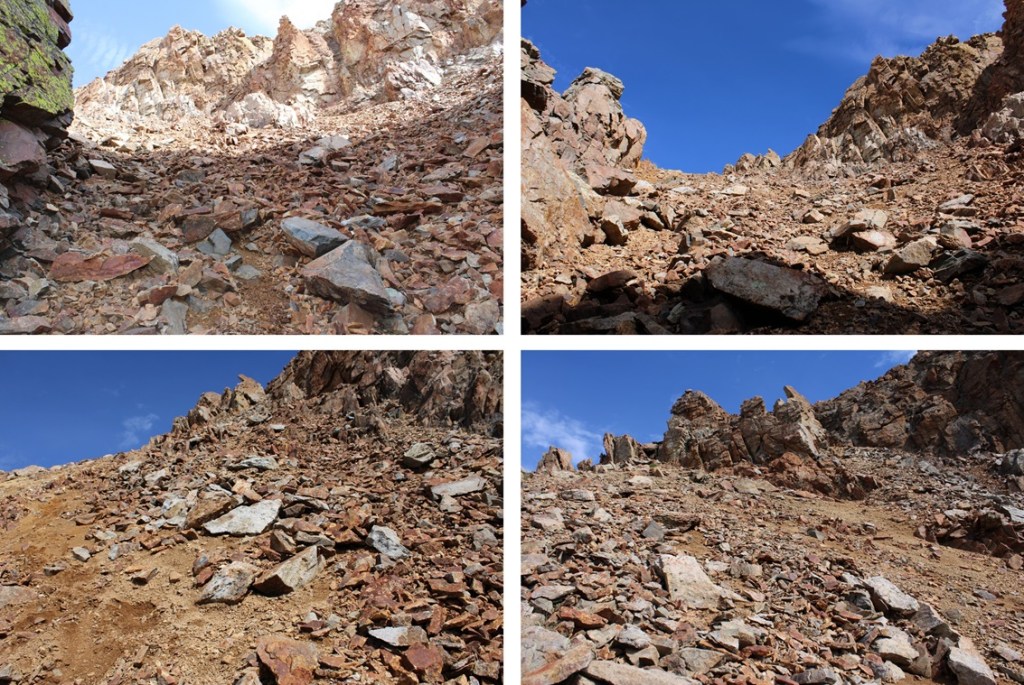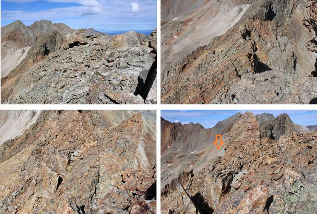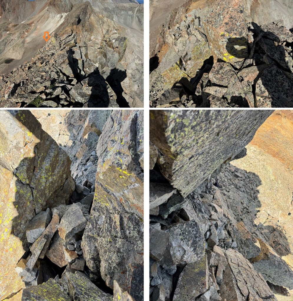 Once the scree ends, if you haven’t already, now is the time to put on your helmet. The rest of the summit is class 3 and class 4 on the loosest terrain I’ve ever experienced. NOTHING is stable. Trust nothing above, in front of, or below you without attempting holds several times to make sure they are solid. There is large kitty litter on solid rocks, loose talus, and rock slabs that look stable but are hanging precariously, especially from above.
