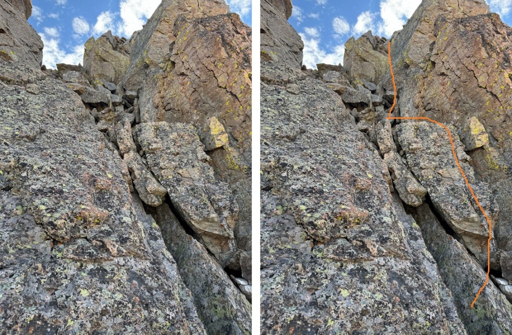 Once in the upper basin, there will be an obvious drainage to the right. I went through the drainage, rock hopped for a bit, and then ascended 600’ of the worst talus ever to a gully. I put on my helmet and started up. Here’s the overall route: