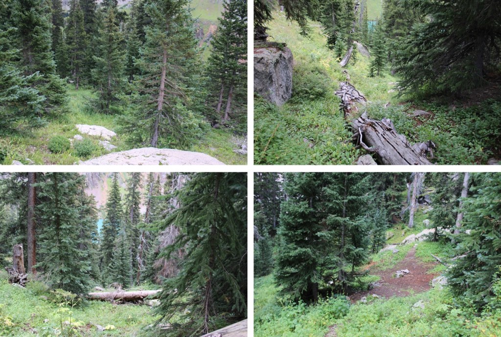 Once I arrived at Blue Lakes, there were several social trails to campsites. I stayed on the trail closest to the lake, skirting the west side, towards a creek flowing into Blue Lakes.
