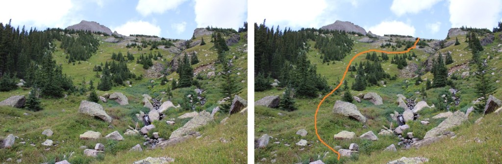 At the last campsite before the creek, I followed the drainage on the right side of the creek up to treeline.