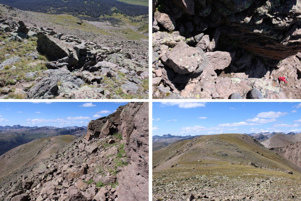 I was able to follow scree and tundra down to the 13351/Ute Ridge saddle. Now is a good time to look at the route you want to take to gain the ridge.  I stayed below the rocks, but was able to find game trails through the scree to the ridge.  The ridge proper has a lot of unavoidable rock formations, so I wanted to stay below them until they were gone before gaining the ridge.