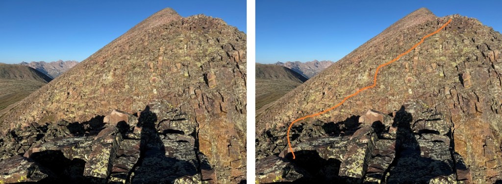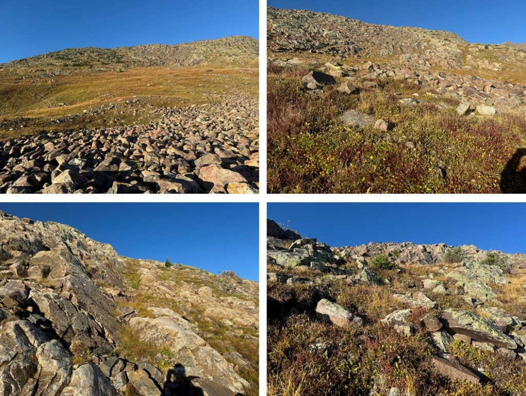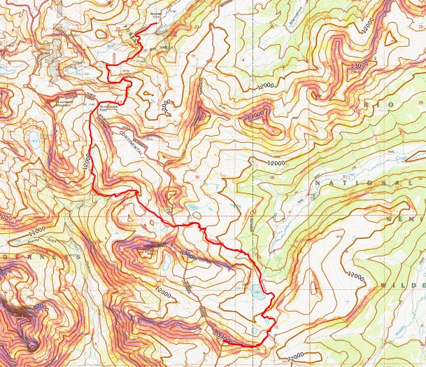At around 12250’ of elevation I left the trail, and headed for the ridge, doing my best to avoid the willows. The route here is all class 2, and you can pretty much pick any line of tundra and it will get you to the ridge. This is the route I took: