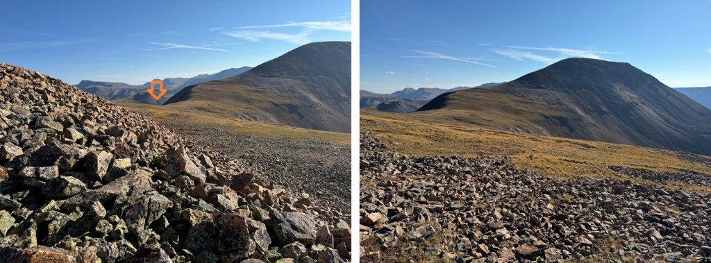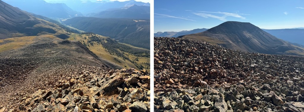 I followed the ridge east, until I came to a dropoff of sorts.  Visually, it looked like the scree was continuous and went all the way to the rocks at the bottom.  However, that was not the case.  I ended up descending about 100 feet on scree, and then everything was loose talus, and steep, so I made my way climbers right to the ridge, and descended that way.  If I were to do this again, I would have just taken the ridge to the right.  It goes at easy class 3, and there’s talus, but it was much more stable than the talus below the scree.  Also, EVERYTHING moves here.  More info/pictures to come on my return route of this area.