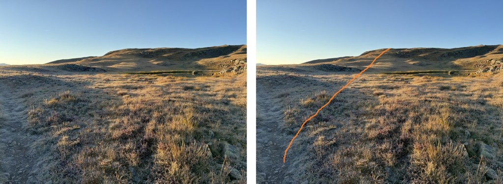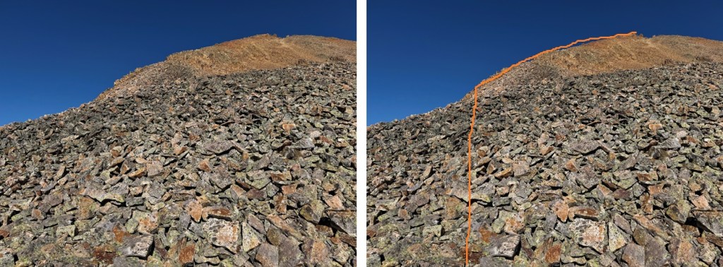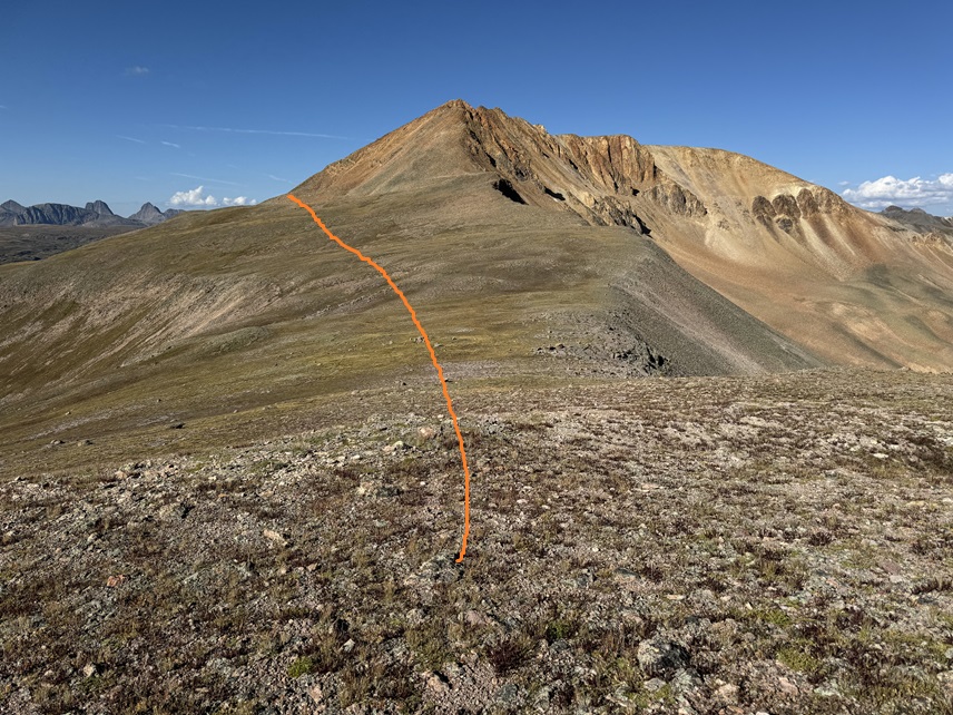 I needed to get to the ridge, and did so on tundra mixed with scree.  This is the overall route I took to get to the ridge