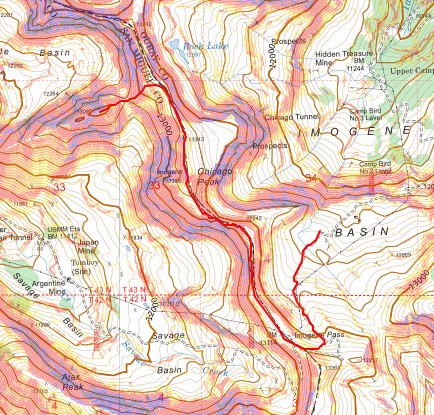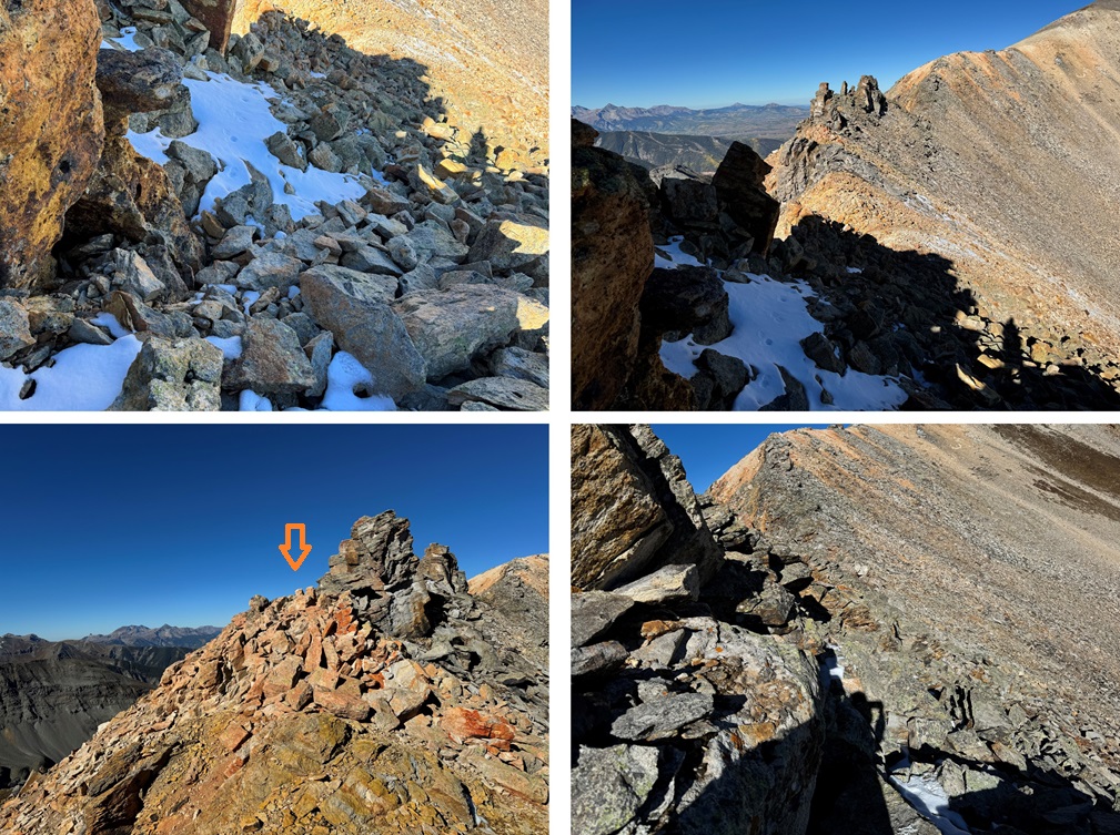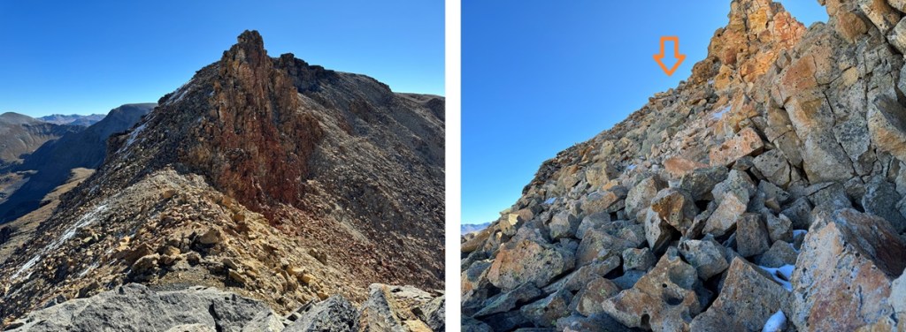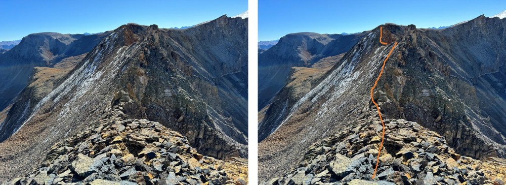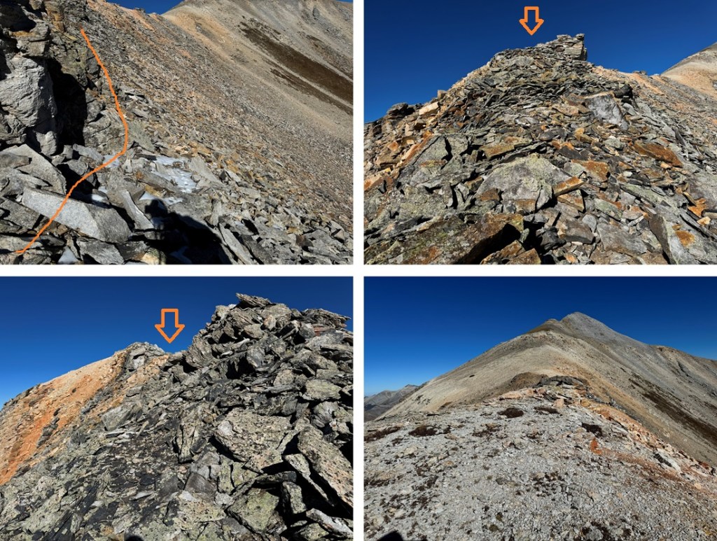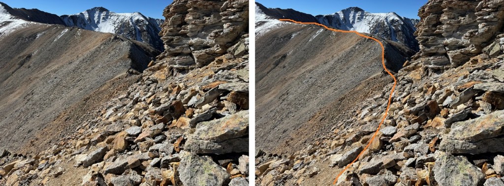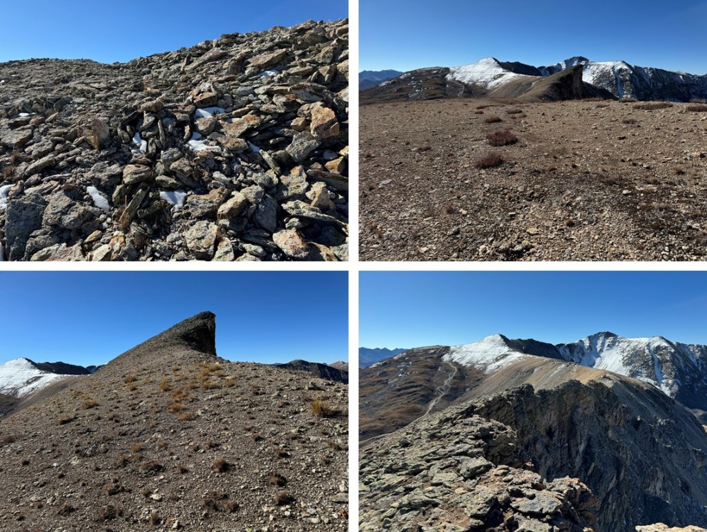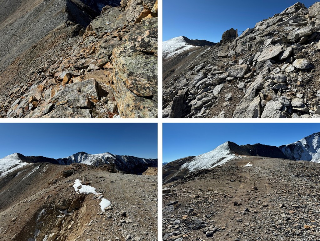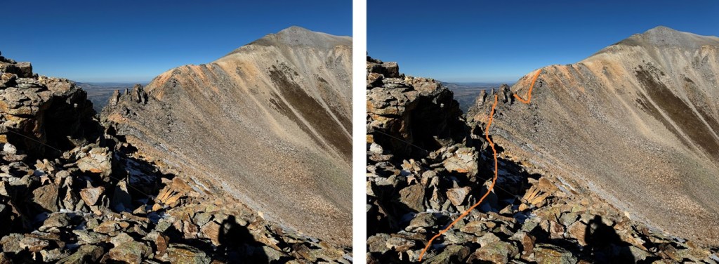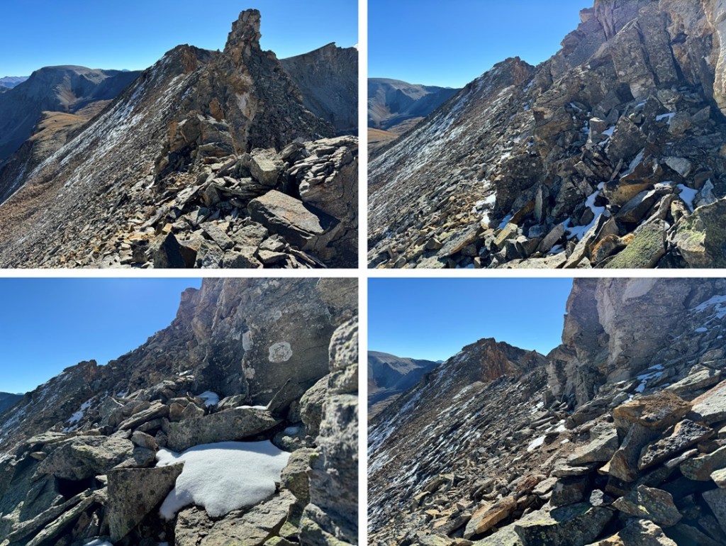 Maps show a trail here, but if there is one, it’s faint/has been destroyed by rockfall. This hike is class 2, but difficult class 2. Everything is loose. The talus and shale are not secure, and there’s exposure, so be mentally ready for more than a normal class 2 hike. Watch your step, as there are large metal wires strewn all about the ground on this ridge. There’s a trail until you hit this point, then you get to route find. From here I could see Chicago Peak. This is the route I took: