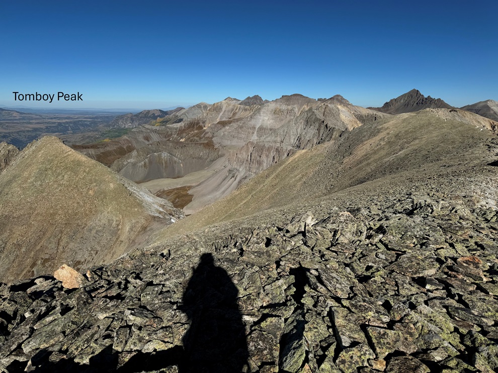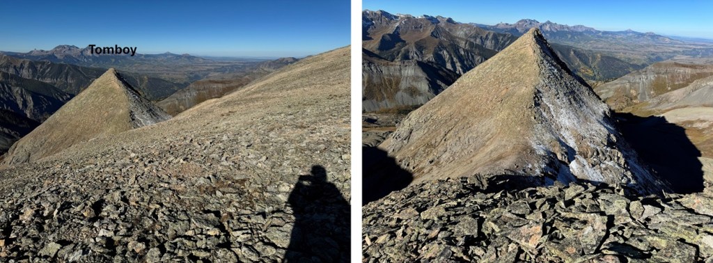 I then turned left, and headed west towards Tomboy Peak, losing 400’ of elevation on very loose shale (no trails here, watch your step).