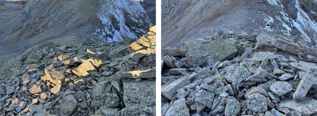 First, I continued hiking down the ridge until I came to a small saddle at 13220’. If you’re lucky, you’ll see the game trail to the right that will circle you back to the saddle.