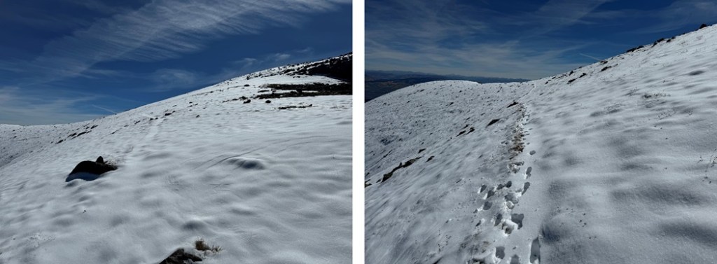 However, on my way back I could see a faint trail under the snow that skirted Goat Peak to the left, so I took that back to the ridge. I’m not sure if this is an actual trail or a game trail, but it went.