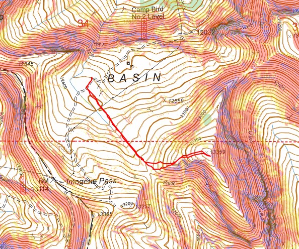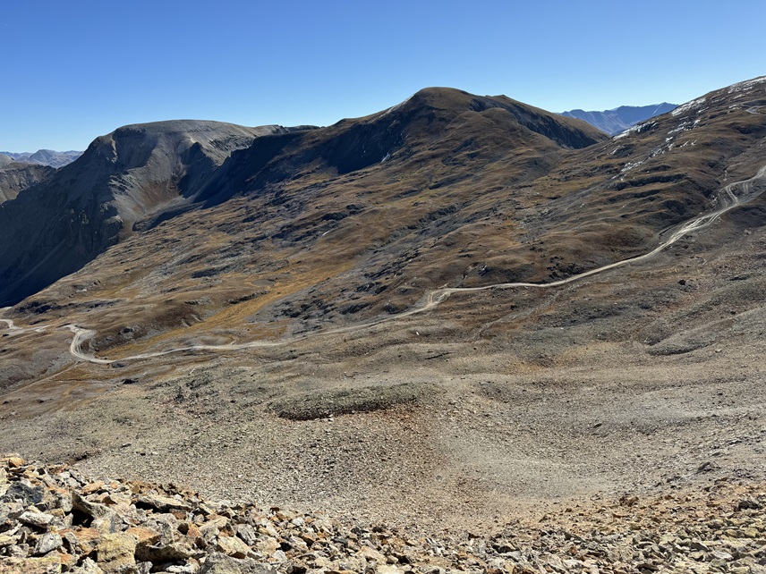 Imogene Pass road is a difficult 4WD road (26A). Be prepared for large rock slabs and narrow shelf roads. I parked below Imogene Pass at around 12500’ at a pull off and was on the trail at 6:40am, as soon as I could see well enough to hike without a flashlight. I started by following the 4WD dirt road towards Imogene Pass. While it had recently snowed in the area, all the snow was sticking to the north slopes, so there wasn’t any snow on my route today. I’ve been in the area a few days, and I’d thought the snow would have melted out by now, but it seems to be lingering on.