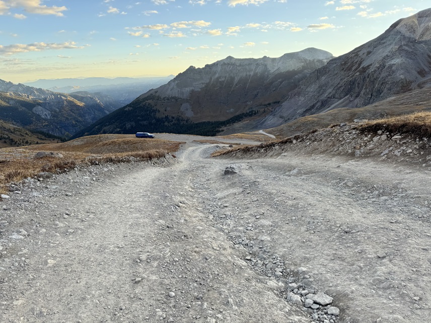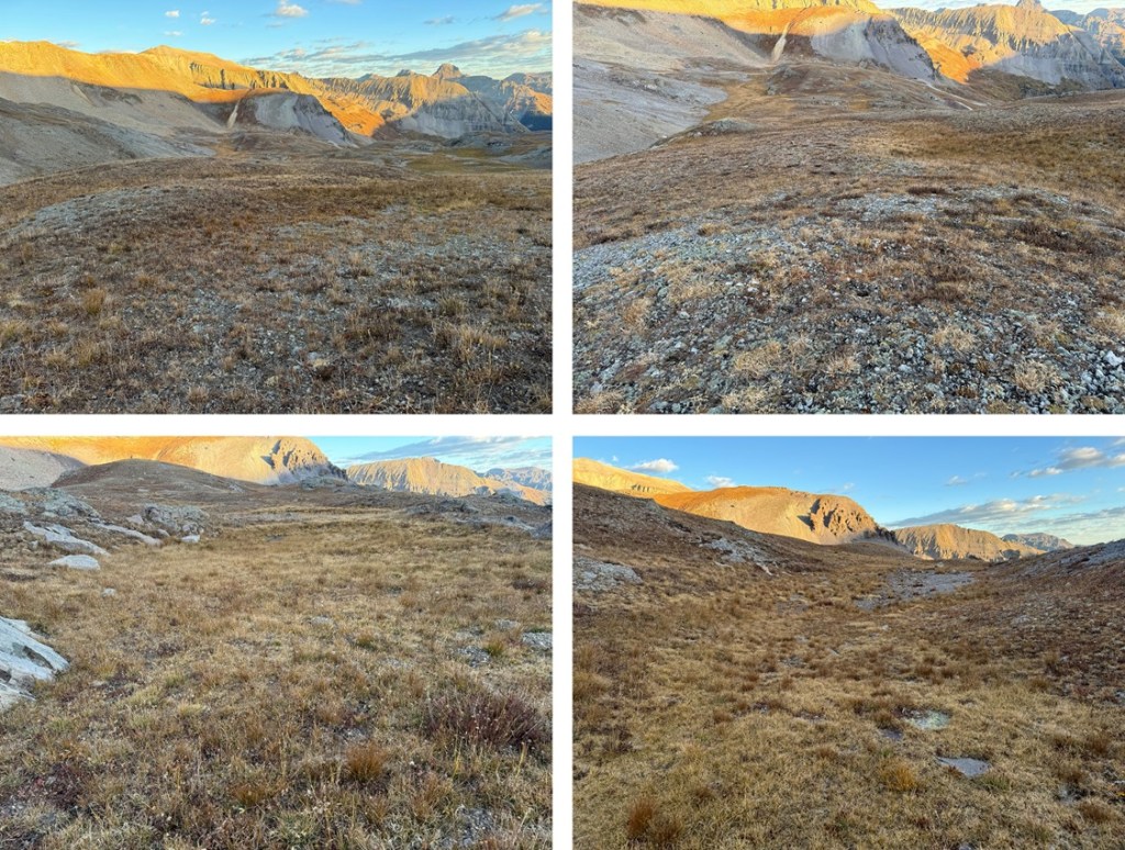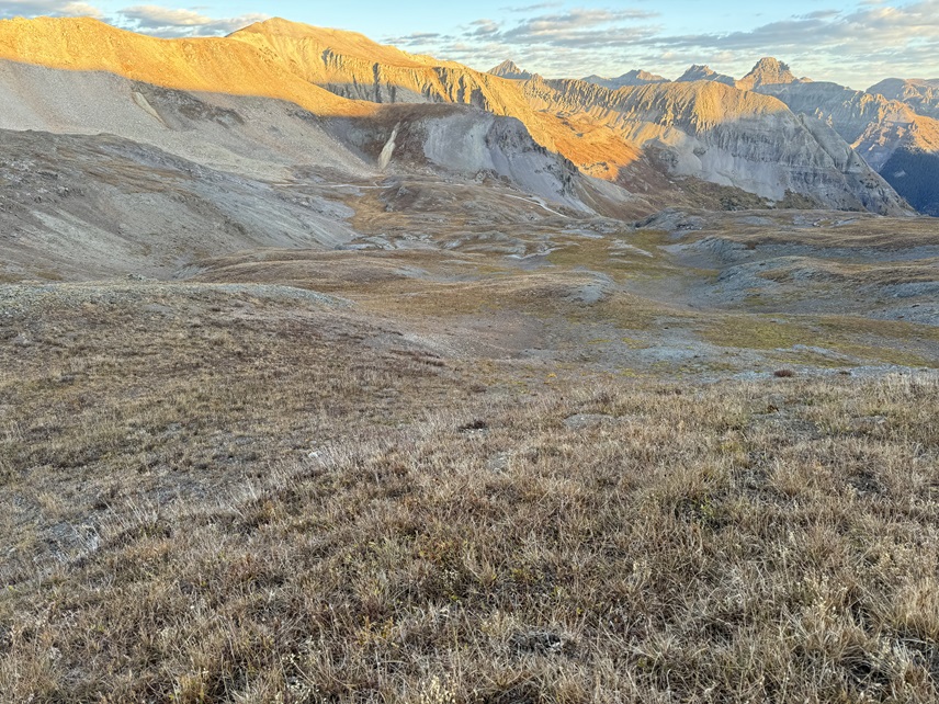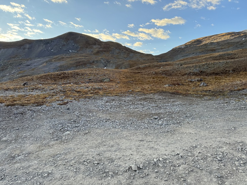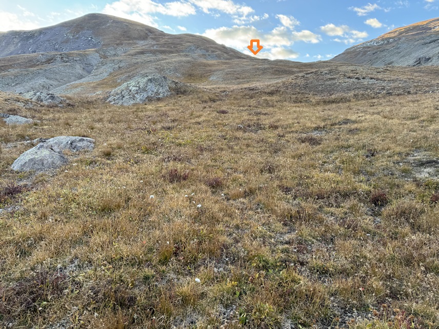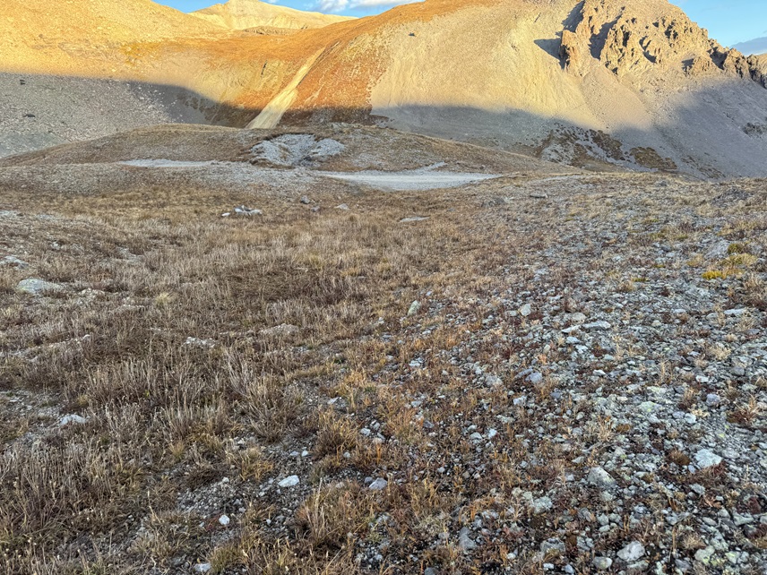 At 12590’ there’s a dispersed campsite with an old fire ring. This is potentially another place to park. Here I left the road and started hiking on tundra southeast towards an obvious saddle.