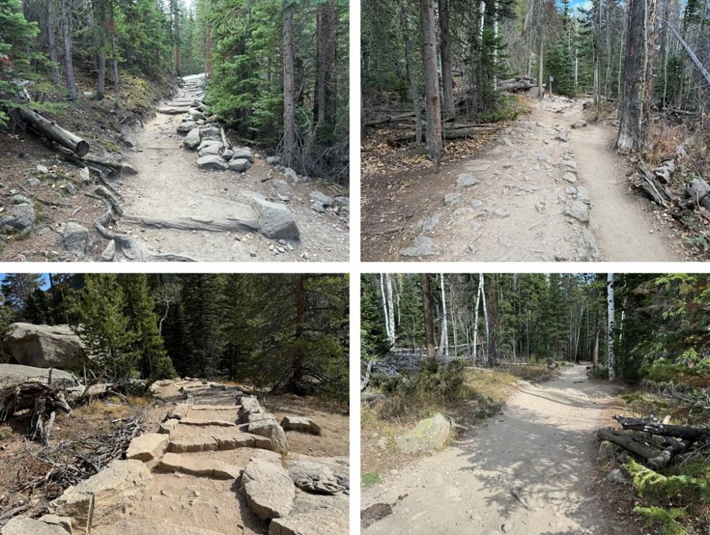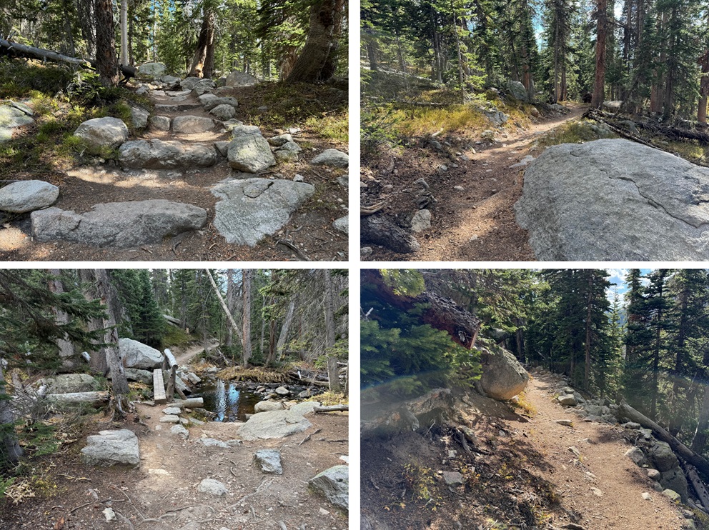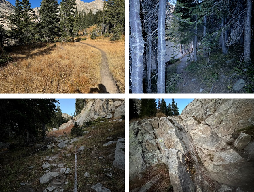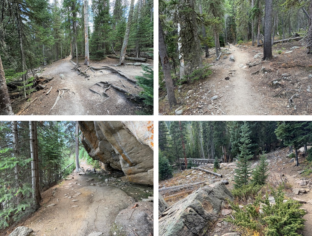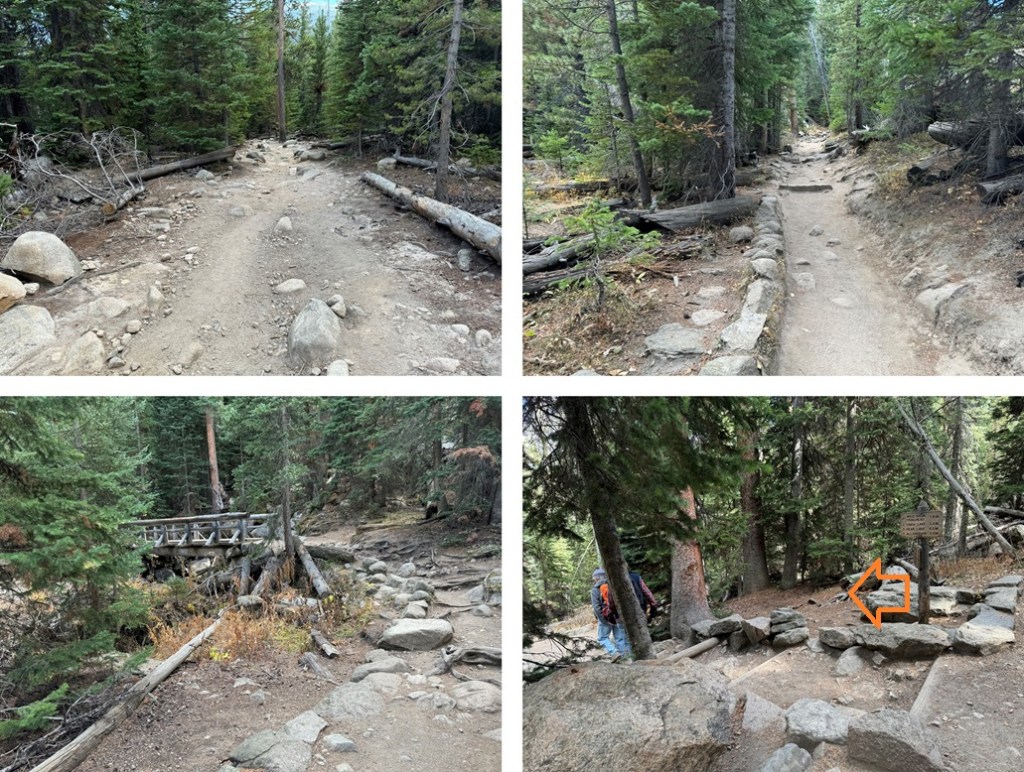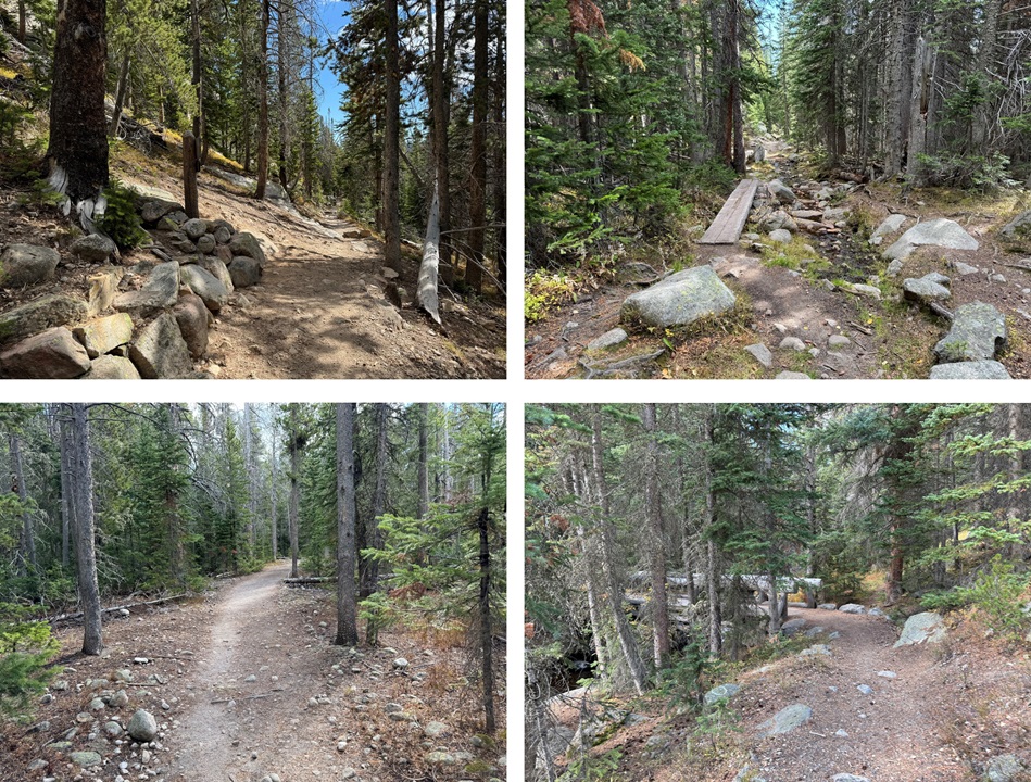I followed the trail all the way to Thunder Lake. This is a class 1 trail with many junctions, but they are all clearly labeled. I just kept heading towards Thunder Lake, and if Thunder Lake wasn’t on the trail sign (which it wasn’t always), I followed the signs to Ouzel Falls, and then Thunder Lake was on all the rest of the signs. Along the way I passed Calypso Falls and Ouzel Falls. Here are some pictures of the trail and junctions to Thunder Lake: