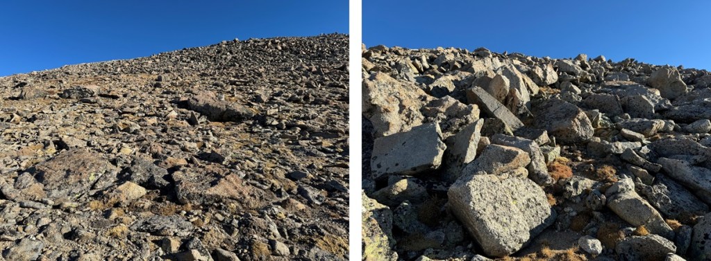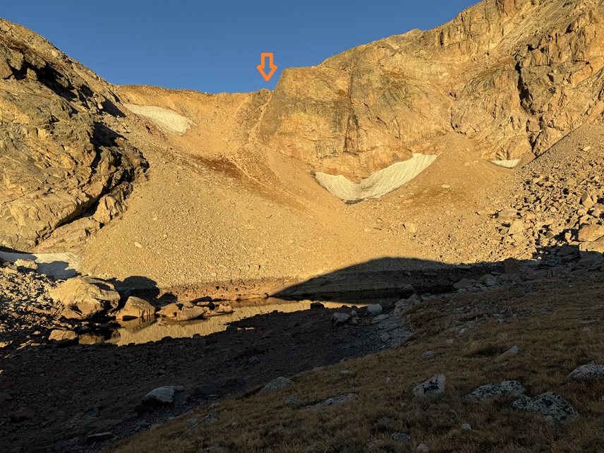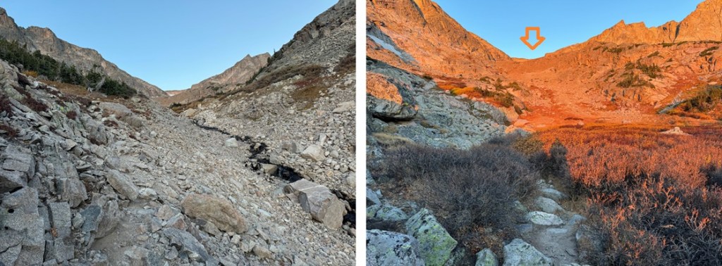 This part is choose your own adventure, but the remainder of the hike is class 2. You’re just trying to gain the saddle. I’d been here before (when I was climbing Isolation), and just went down the scree, which worked well. However, this morning I wanted to try the gully to the right. It was more solid than the scree and offered hand and foot holds. You can take the scree up as well, as all routes here lead to the same place.