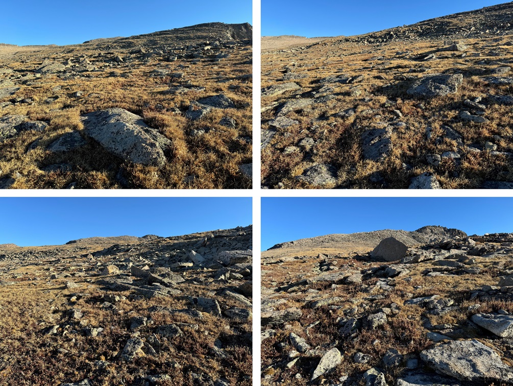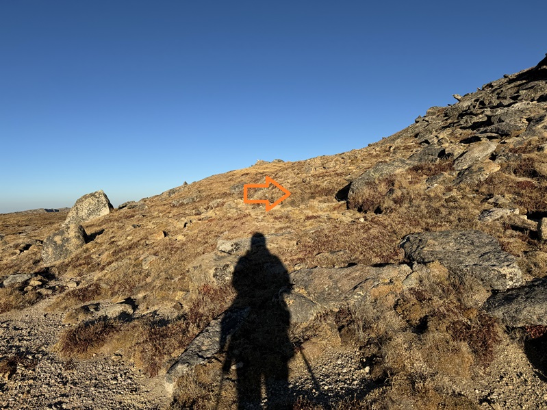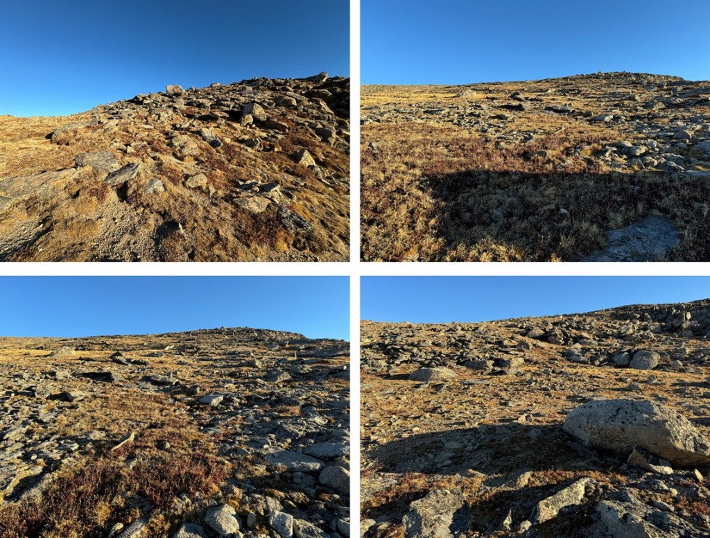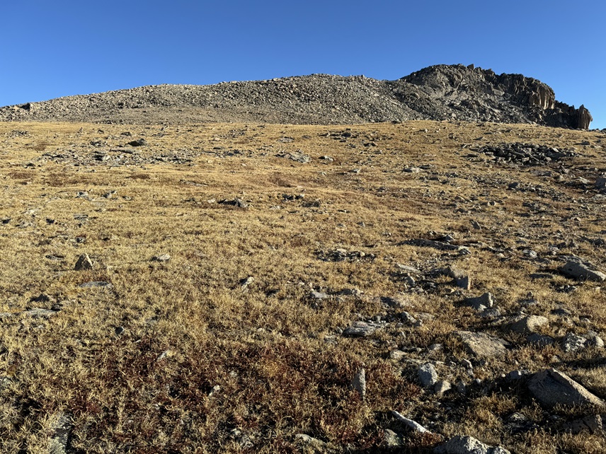 This ridge has a gentle slope and is filled with tundra and large boulders. I was easily able to navigate around the boulders, staying on tundra most of the way. I just kept heading north. I gained 1250’ of elevation in about 1.1 miles to the summit from the pass.