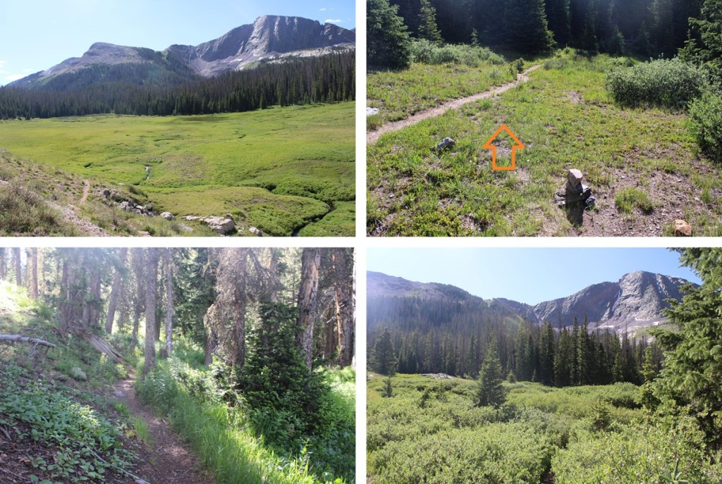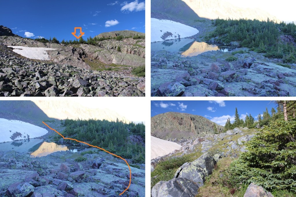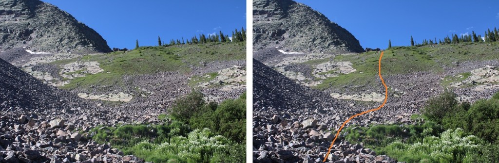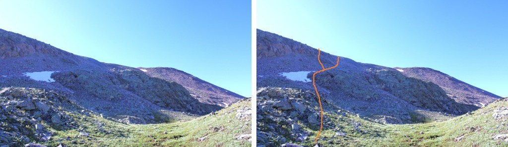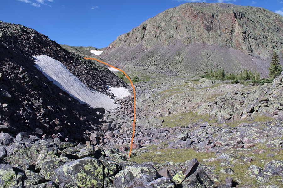 At the base of the basin it’s time to leave the trail. I’d hiked about 2.7 miles to this point. Here I left the trail and headed southwest into the upper basin.