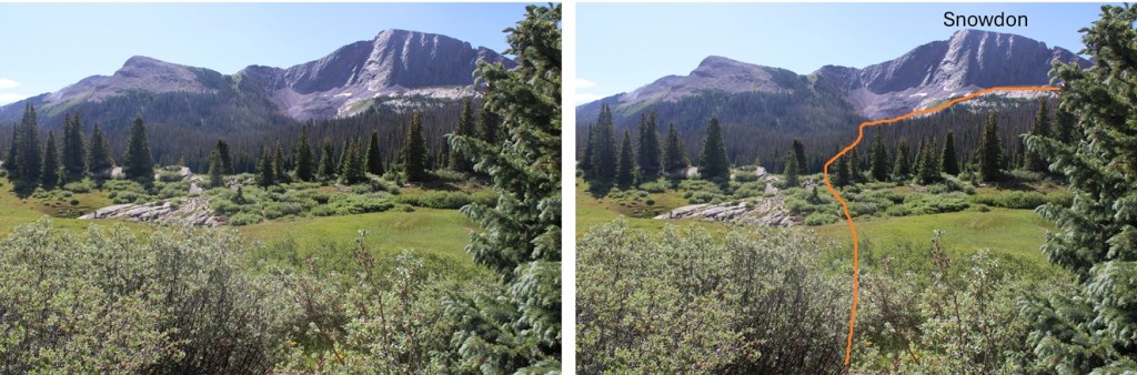 At the trail junction I went left and followed the trail through a meadow and towards the basin below Snowdon Peak. If you’ve done the West Buttress of Snowdon, it’s much of the same route. Here’s the basic overall route to the upper basin: