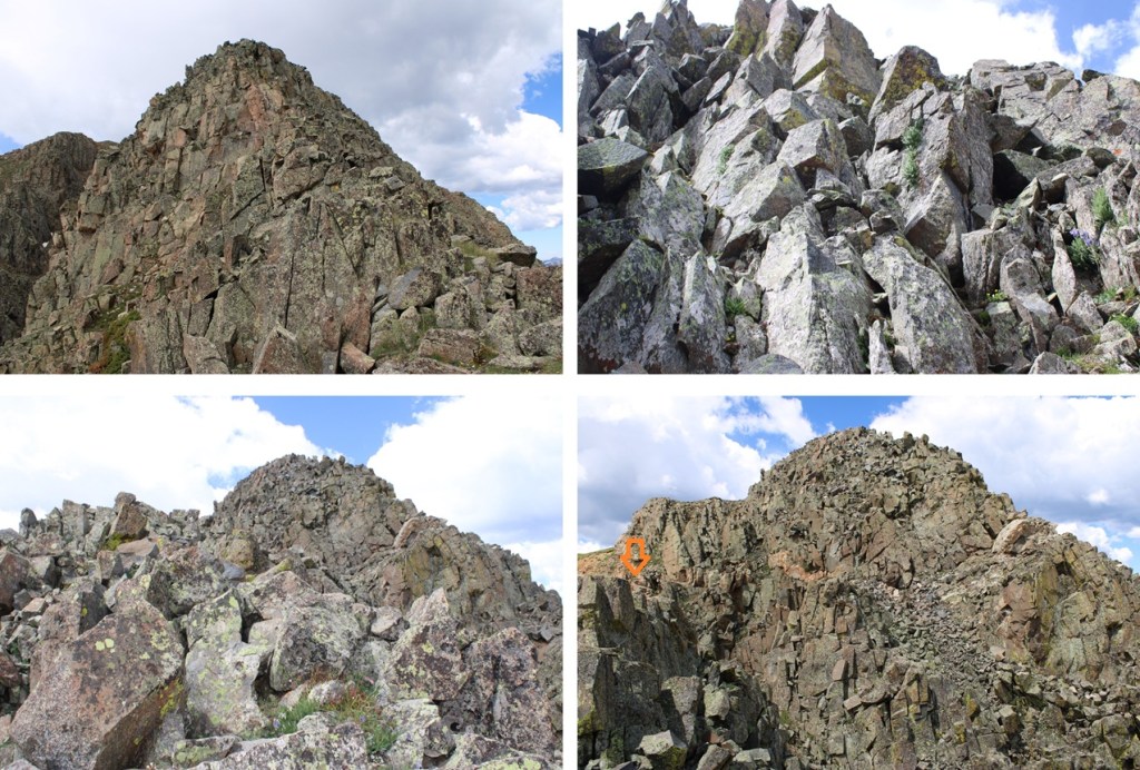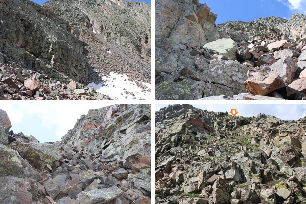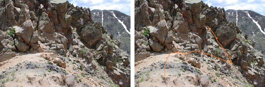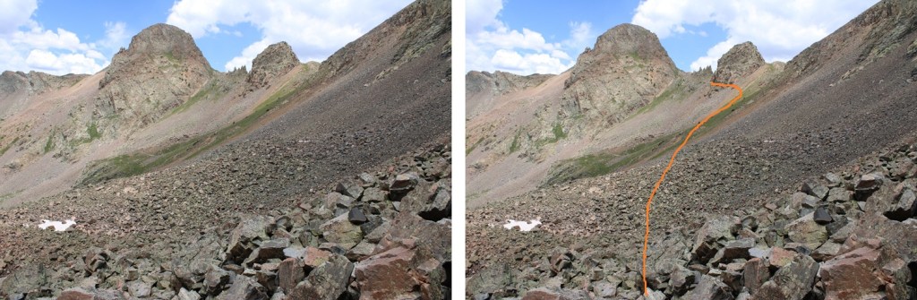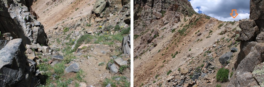 From here it’s a great time to look at the route before you. This is choose your own adventure, and there seem to be a lot of different possibilities for gaining the ridge. All class 3. This is the route I chose, first going up the loose and rocky gully then straight up the class 3 face.