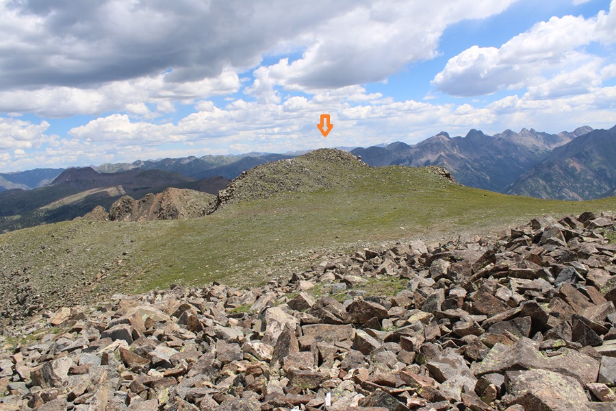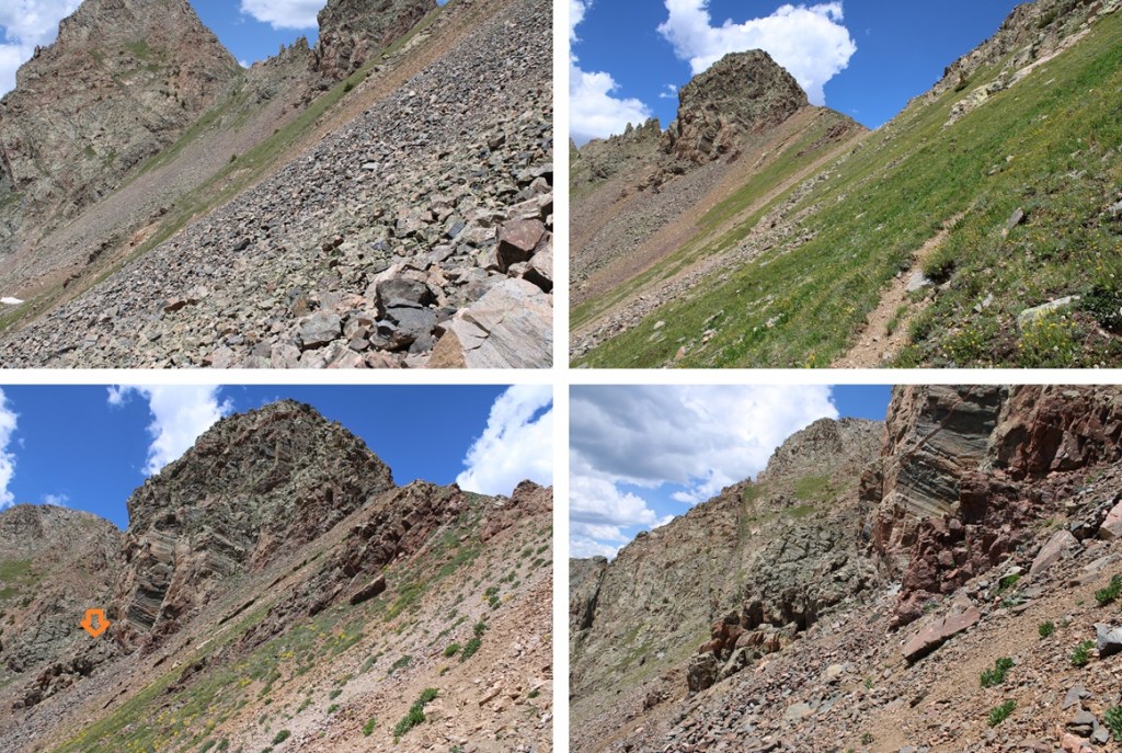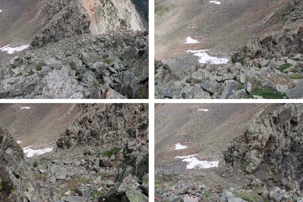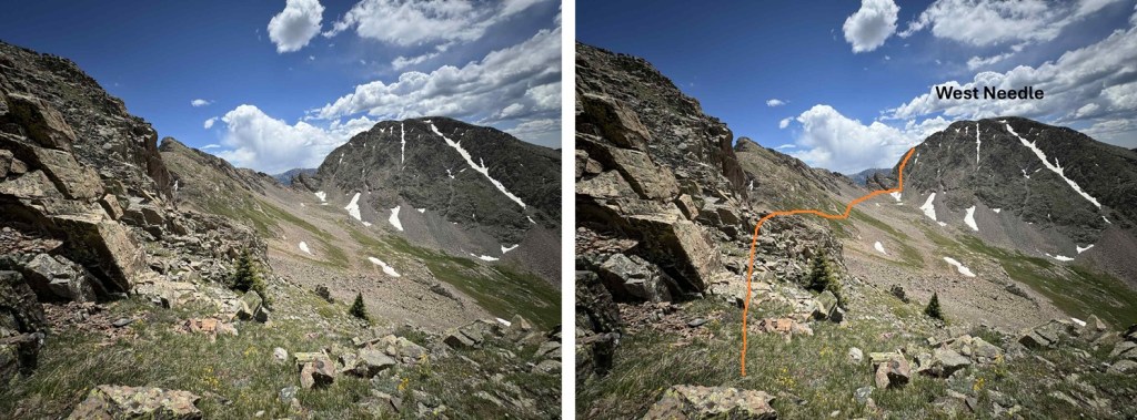 Now at the saddle I had to descend a bit to traverse towards West Needle Mountain. I descended about 25 feet to the south and found an access gully on the left that would get me around the rock outcroppings.