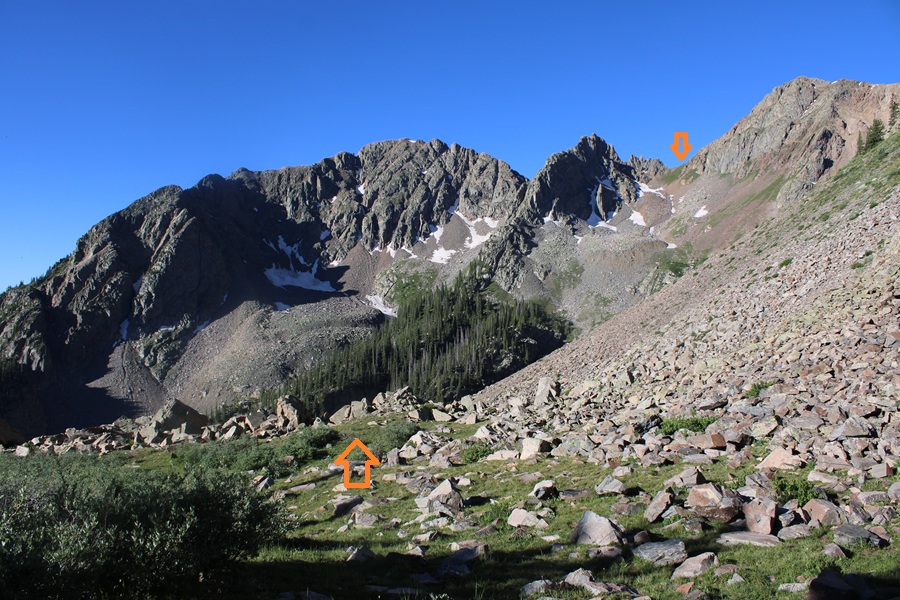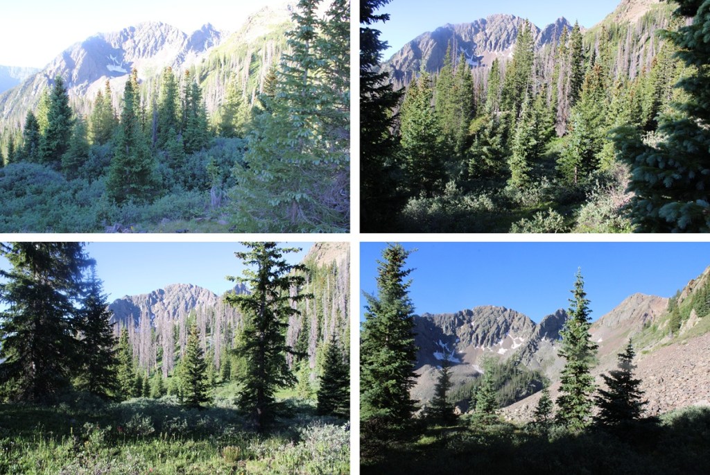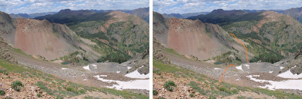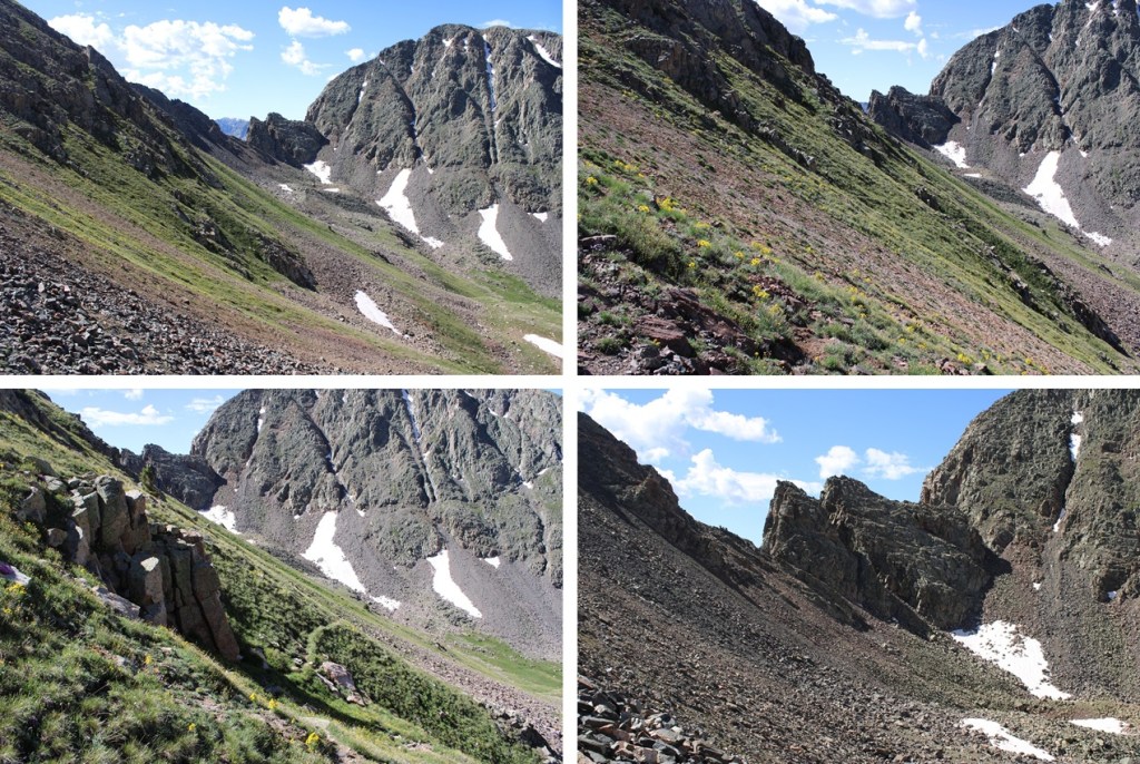 The trail stops at 11750’ and now it’s time to bushwhack. I lost 400’ of elevation as I headed southwest towards a gully I couldn’t yet see. Here’s an overview of where I was headed.