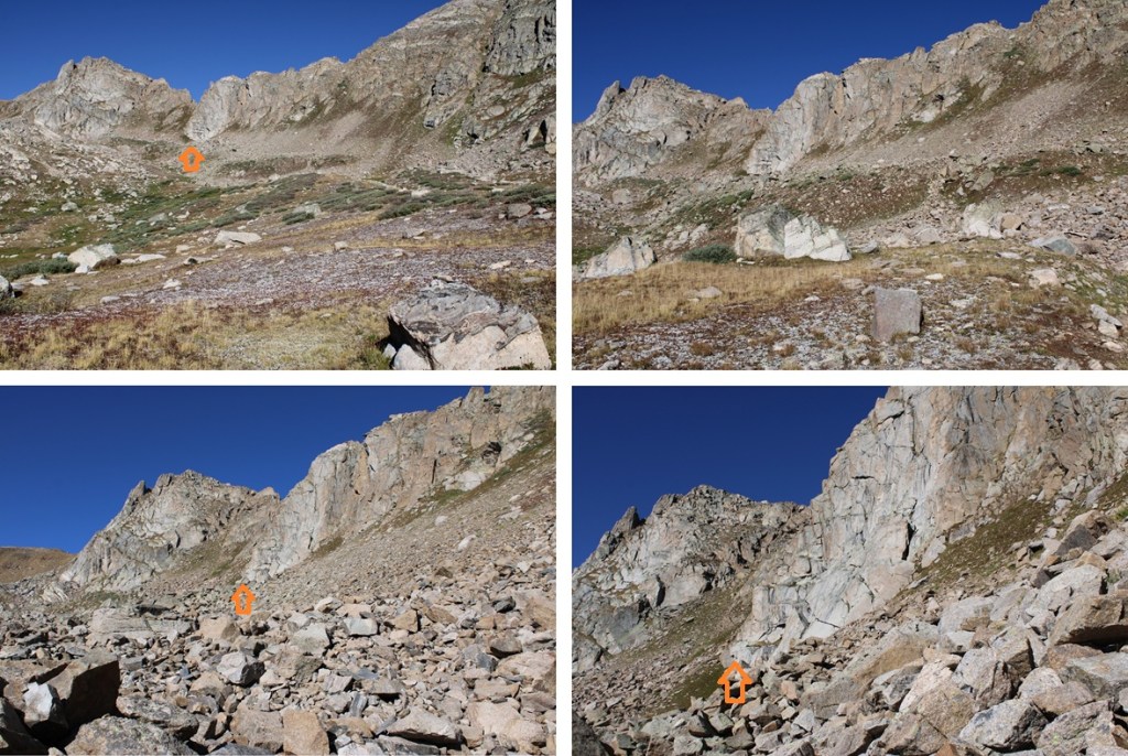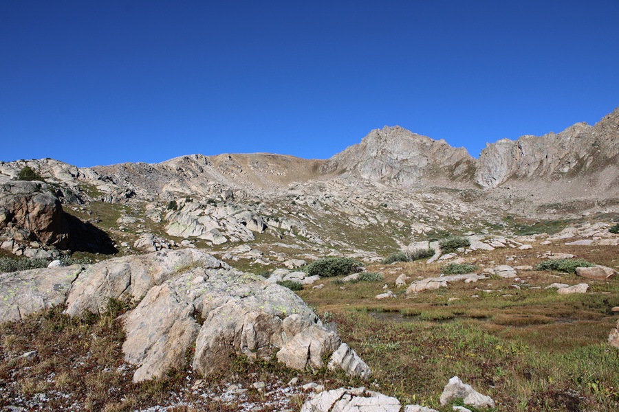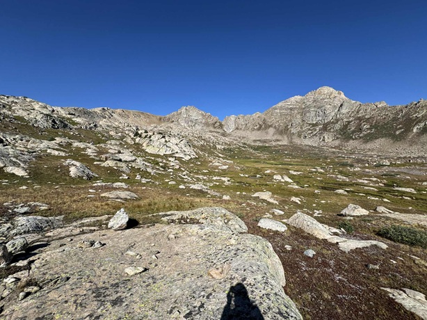 Back in the basin at my campsite it was only 9am. I had a quick snack and started out again, this time taking the pink route up to 13204. I started out by heading northwest up the basin towards the base of a large rock outcropping. This is choose your own adventure, and all of it is class 2, just make your way towards the large rock outcropping.