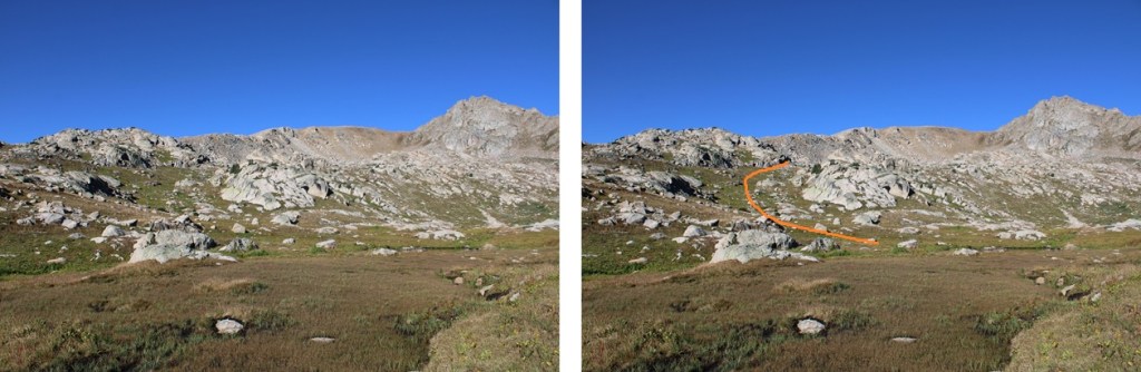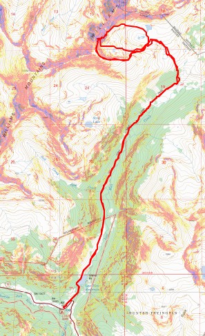 This is a three-trip-report peak for me, so my numbers are all splattered together. I had an idea this peak would take me several attempts to get, so I came prepared and brought my backpacking gear. I’m going to give you the three reports as they happened. I found a way to make this a class 4, 3, or 2 peak. You can choose your route. Either way, the approach to the place I camped in the upper basin is the same.