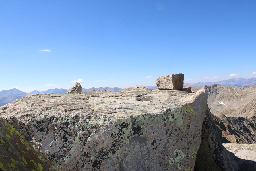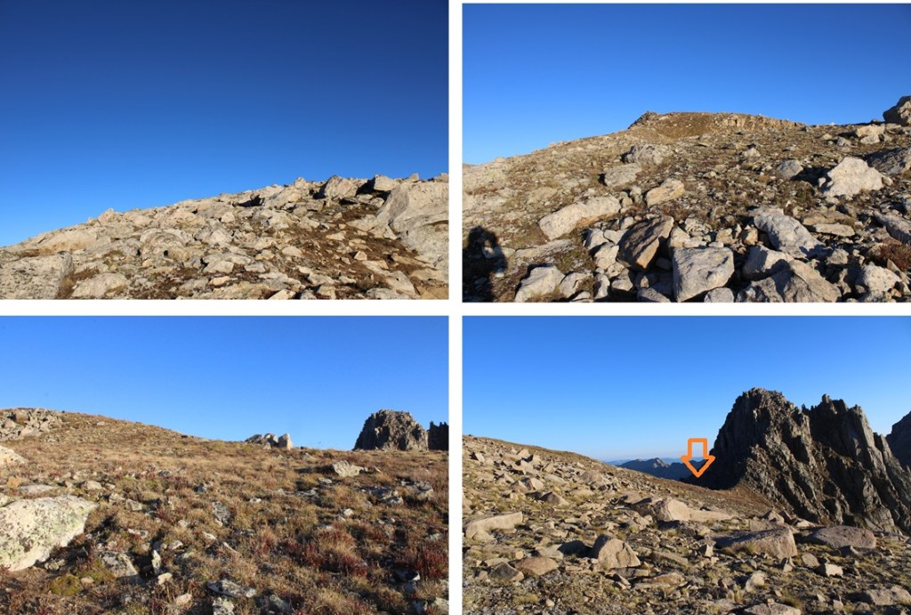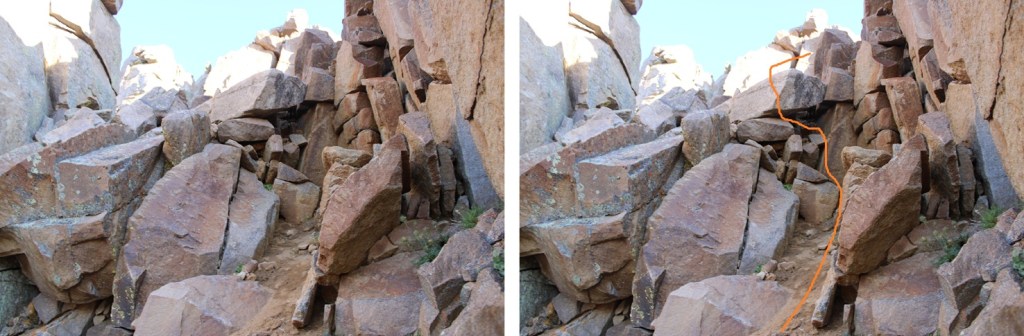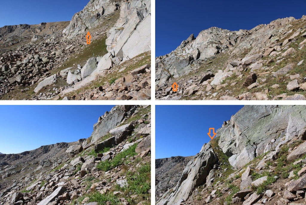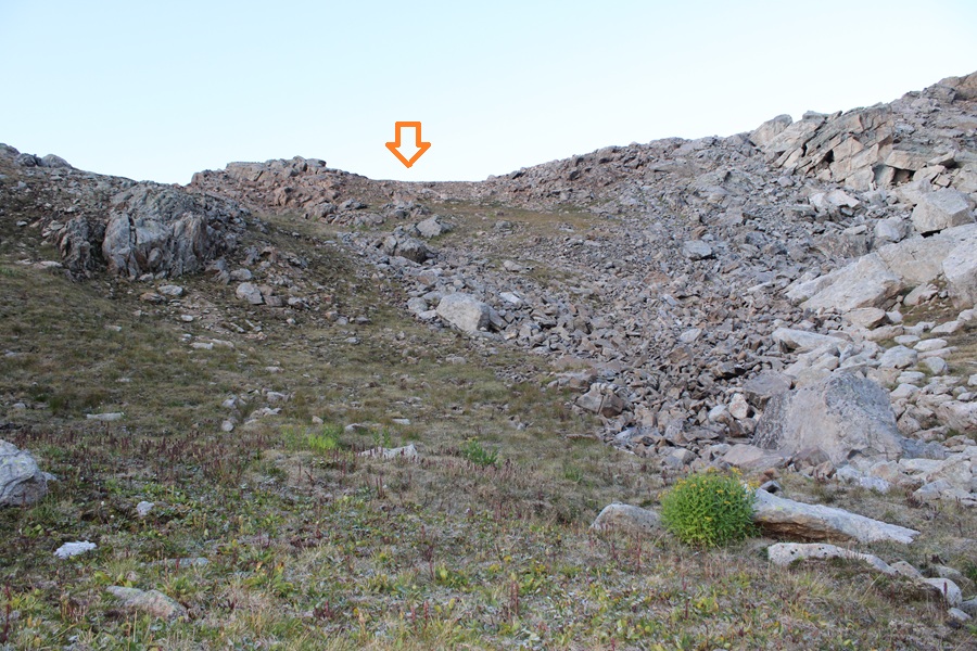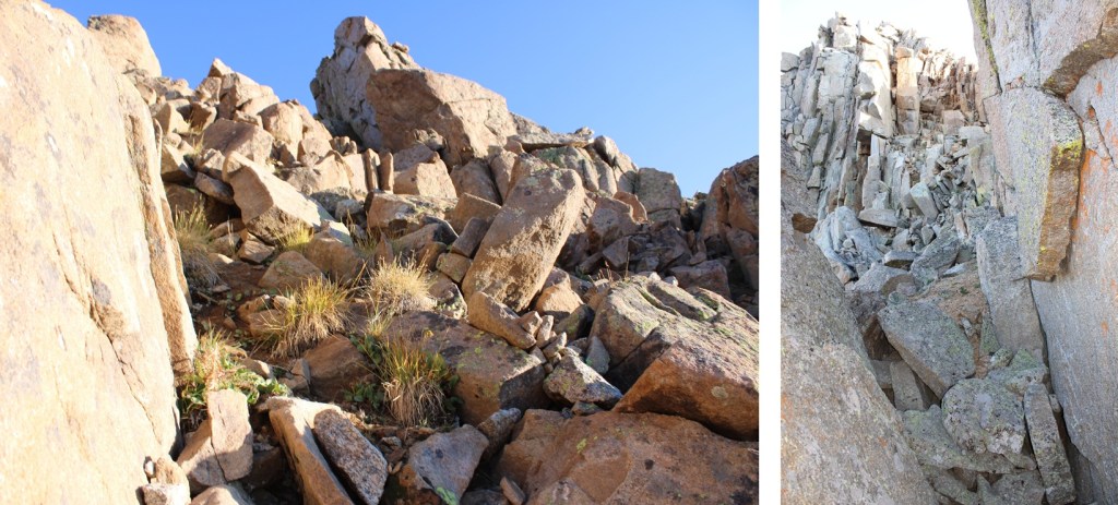 This was the move that I didn’t feel comfortable attempting without ropes. It was very similar to the final crux on Jagged after the rockfall, but when I was there I had rope to help me. The rocks above this problem overhang several feet over what look like easy steps from below, and it’s steep on all sides and all the rocks are loose, making depending on them for support/balance poor judgement. The picture doesn’t do this area justice, and it wasn’t until I was under the rocks I realized the difficulty. If I saw this picture, I’d go for it, but when I was there I knew it was too dangerous for me to do solo. I could see where I needed to place my hands/feet, but I wasn’t tall enough to make the moves. Rock climbing shoes might have helped, and a rope definitely would have, but I had neither. I spent about 15 minutes trying to find a way up/around this, and in the end turned around. I’d just been on an amazing podcast (seriously, you should listen to it just to know the podcaster: it’s called “Going in Blind” and will change the way you think of your own life experiences). We talked about failed attempts, turnarounds, risk tolerance, etc. and this move was above my risk tolerance for soloing. How terrible would it have been if I’d just talked about my many, many failed attempts and turnarounds and attempted this and failed because I was overconfident? I’d look like a fool. If I’d been with a friend they could have cheerleader lifted me and I could have pulled them from above but solo I didn’t feel comfortable attempting this move. I felt there was a 75% chance I could make it up, which just wasn’t good enough, especially when going solo. However, if you can get over this class 4 move it’s an easy class 3 climb to the summit.