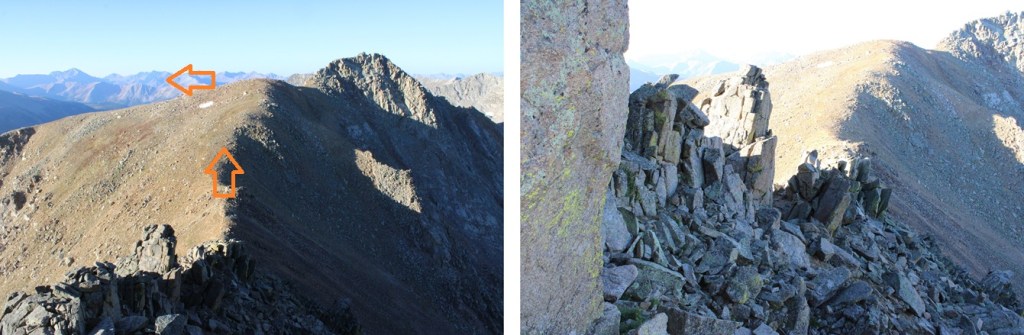 Seeing it wasn’t any better from this angle I reascended and found a gully to head down. I could see all the way down to the valley, it looked class 2, so I decided to go for it. I started at 13100’ and descended the entire way down on class 2 terrain just below where I’d dropped down and re-ascended again on the ascent. The place just before the notch on the return. That gully goes at class 2. I could see the access point from the summit.