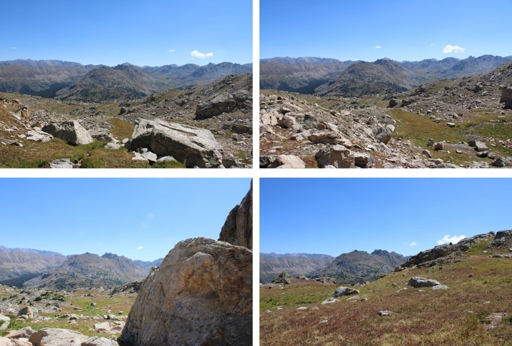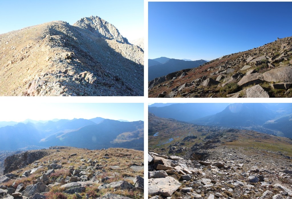 Here are some pictures looking down the gully. It splits at least twice, but each option is class 2, so pick the route you like the best. If I were to do this peak again, I’d take the gully. Tons of game trails, not a lot of scree, lots of elevation gain but no exposure. Just keep this as an option as a bail out point, or another way to summit this peak if you’re dividing the peaks and not doing the traverse.