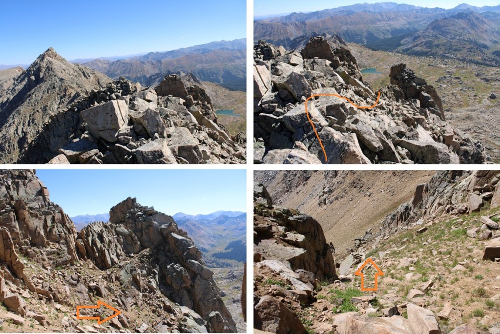Down summit class 2 route: 1 mile, 1100’ elevation loss