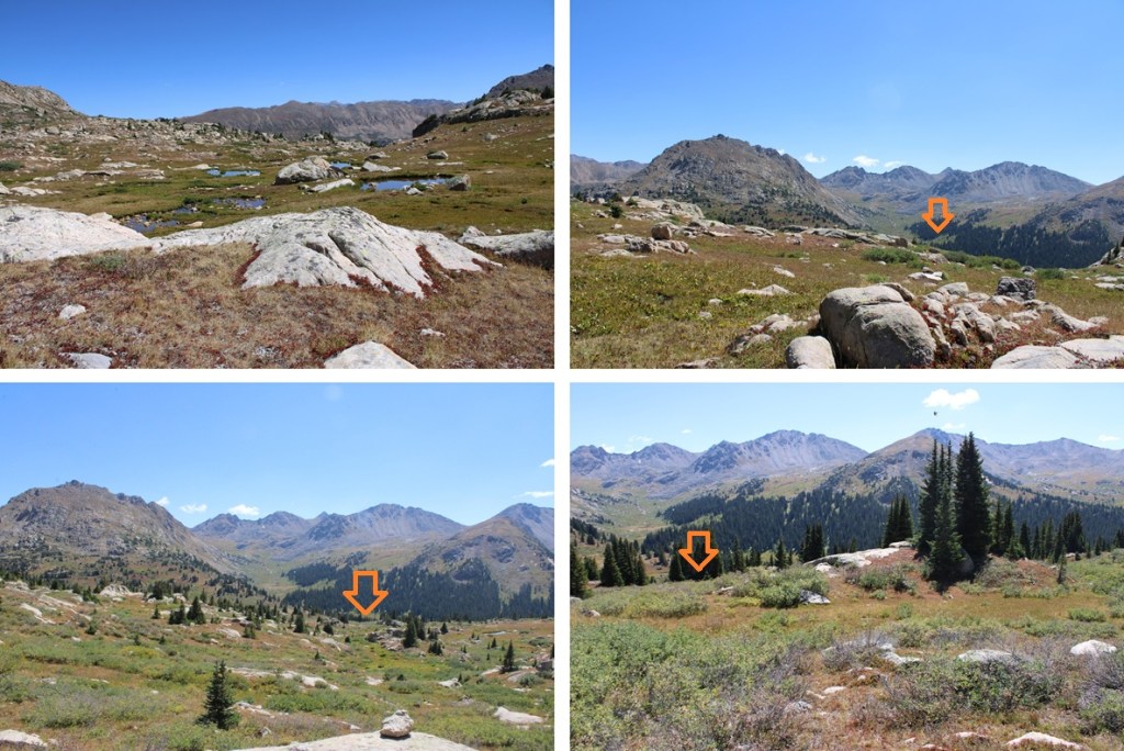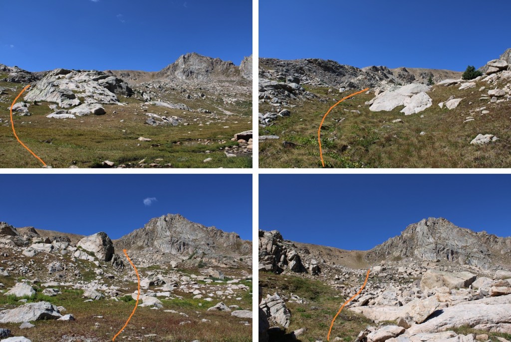 I set up my tent and had the late afternoon to just chill and relax (a goal of mine while climbing this year). While I was there a couple of hunters hiked in, scouting the area (hunting season was to start in a couple of days). I saw them pointing in the distance and getting out their binoculars and looking, then pointing again. I gave them their space, but half an hour later they started hiking towards me and my tent. They whistled and said “Just so you know, there’s a bear behind you about 200 feet, behind the rock you’re set up next to.” I was thrilled with this information, but a bit upset it took them HALF AN HOUR to let me know a bear was behind me. I got up, got my trekking pole, and spent the next 2 hours looking for the bear. I never saw it. I was mentally ok and prepared for the night (bear cannister and all), but still a little upset I never actually got to see the bear. I did hear cow elk calling to their babies in the night, but no more sighting of that bear. In the morning I was off at 6:30am to attempt the ridge (orange route). I started by following the grassy area southwest towards the ridge.