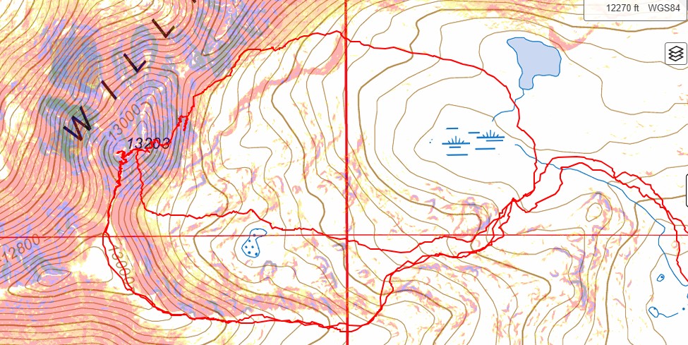 I found a camping spot and set up for the night. This area is boggy/marshy, and it’s difficult to find a spot 150’ from water, but I found one underneath a large rock outcropping. As you can see by the picture below, I found three different routes up/down PT 13024. The orange route is class 4, the blue route class 2, the pink route class 3 (I didn’t really know this beforehand). My first attempt the next morning was going to be to the left hand side, as I didn’t yet know if the ridge would go, and had heard it was the easier side (it wasn’t). I’d been in the area before, and the ridge looked like it went, so in the morning I was going to take the ridge to the summit from the left.