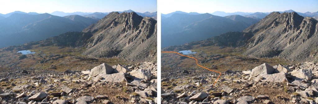 At the top of the avalanche run I could see a large unnamed basin (on a topo map it’s north of Scott Lake). This was where I planned on setting up camp. I could also see the rest of my route to the summit. As you can see from the picture, I needed to lose about 200’ of elevation as I headed into the basin. There are tons of willows here, but also several game trails to navigate through them.