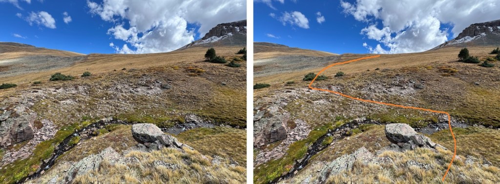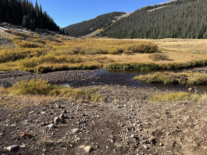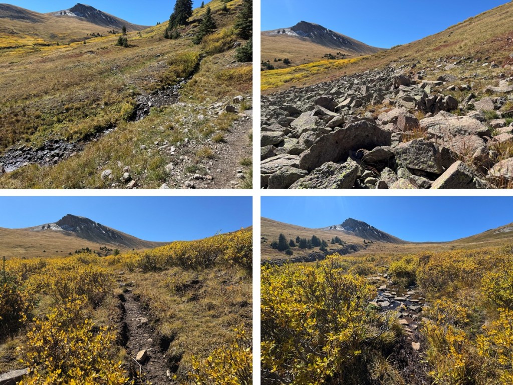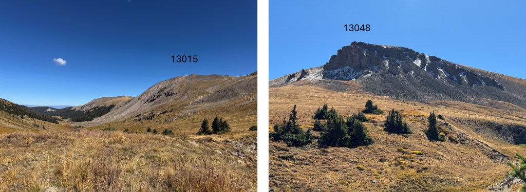 It was a long night, but that was just because I could hear the elk bugling and calling to each other. I’m also pretty sure I heard a cow moose at one point. This was why I’d made this trek an overnight: to enjoy the wildlife and fall scenery. It was worth it. I was the only one in the basin the entire time I was there. The next morning I was up and on the trail by 7am. I crossed the creek on a game trail and headed for the 13015/13048 saddle on tundra.
