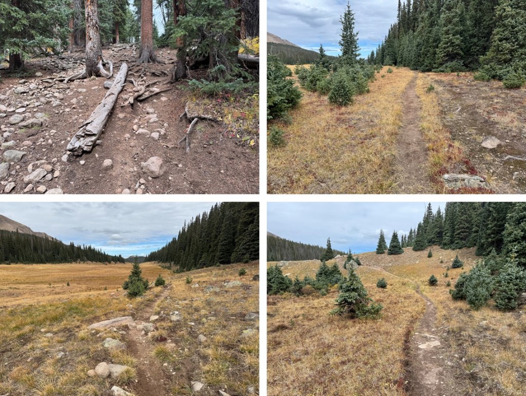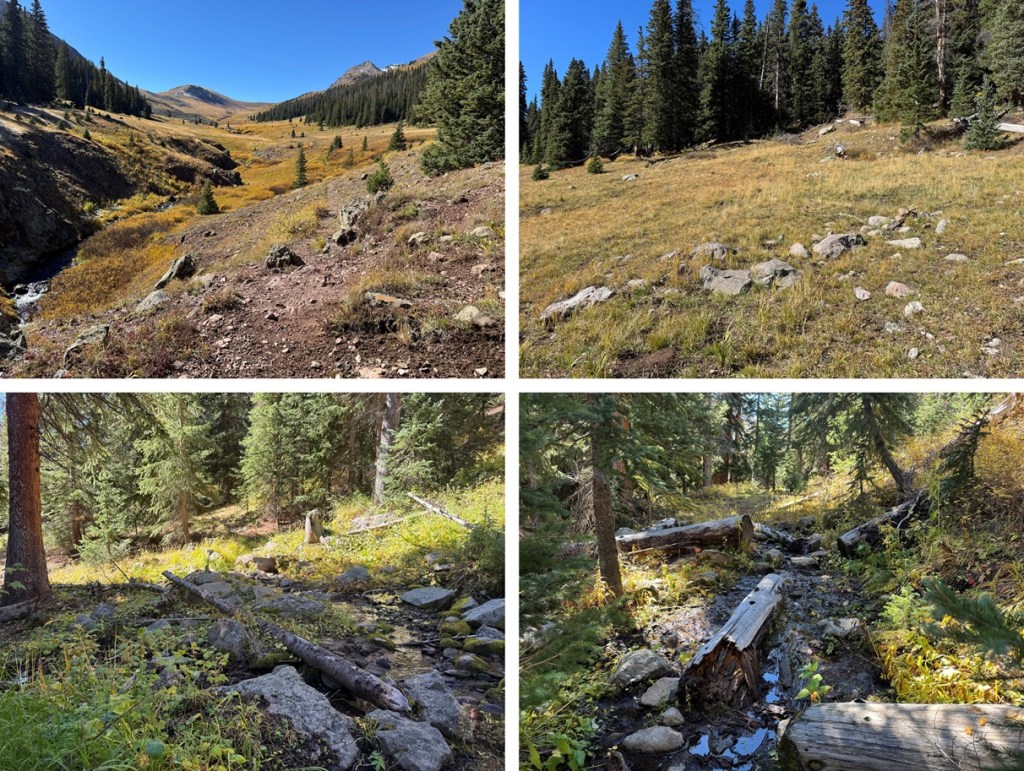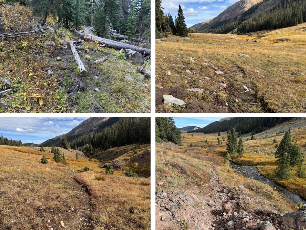 From here the trail can be difficult to follow but there are no trail junctions. It gets marshy and there are many game trails due to the mud and water. Also, horses have torn up this area. Be prepared with an extra pair of socks. From here I stayed on the left side of the creek until an obvious crossing point.