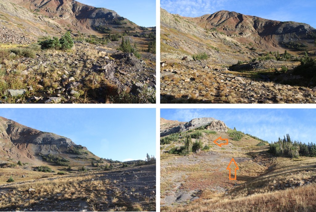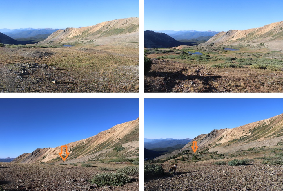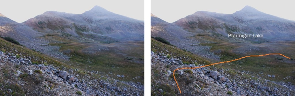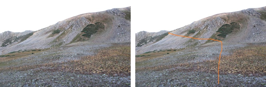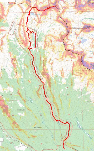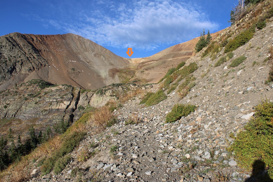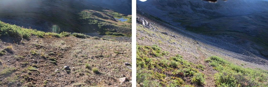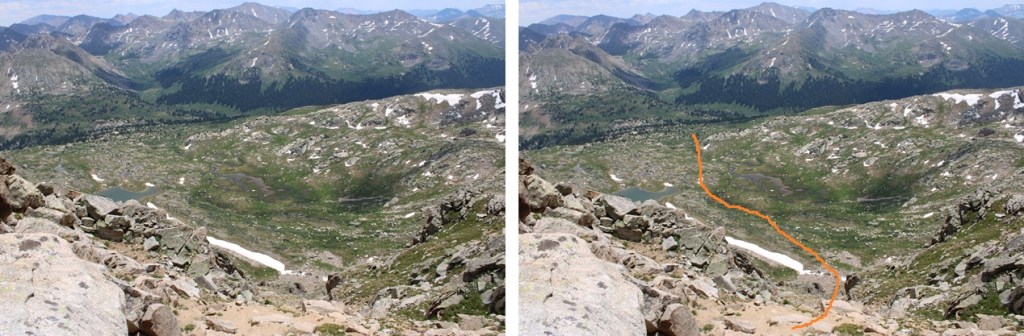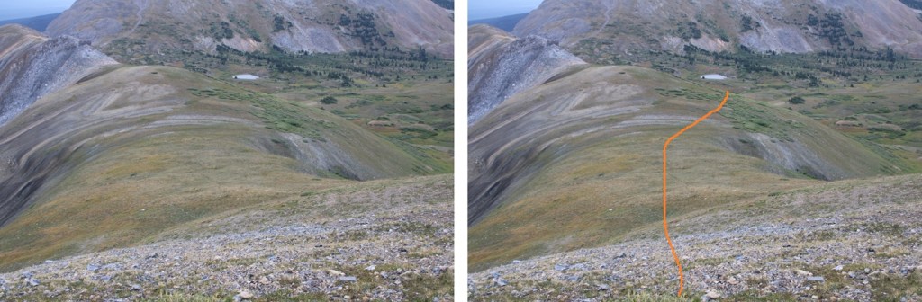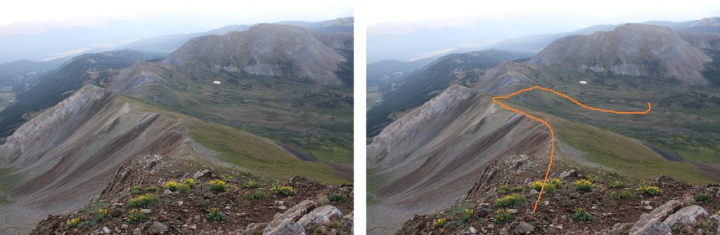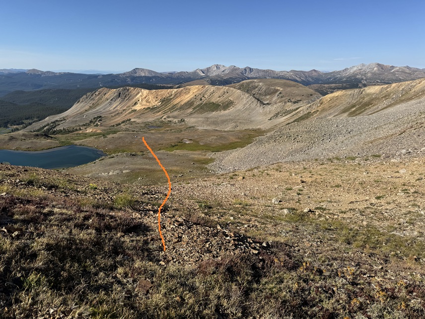 Here’s a view of my route back down the avalanche chute. Notice Deadman Lake in the distance. It’s a good visual for the decent.
