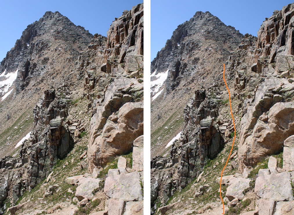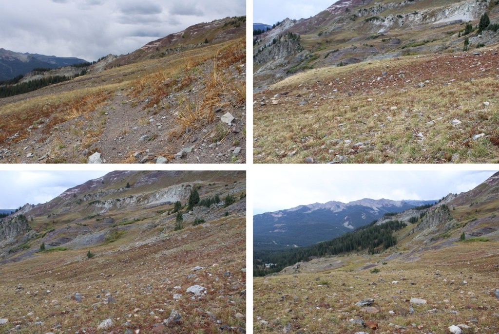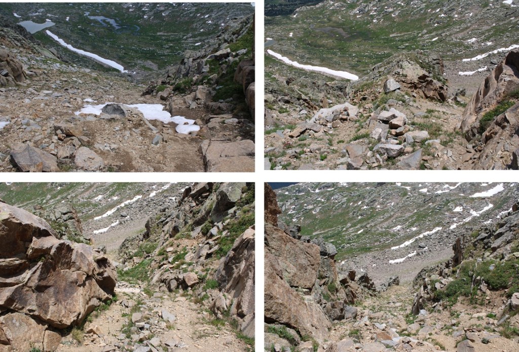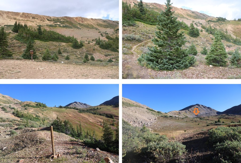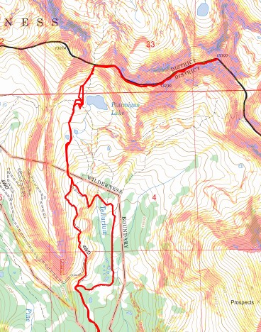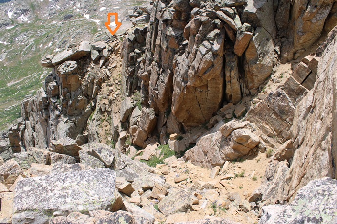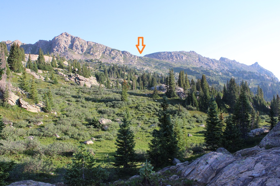 Here’s a view of my route back down the avalanche chute. Notice Deadman Lake in the distance. It’s a good visual for the decent.
