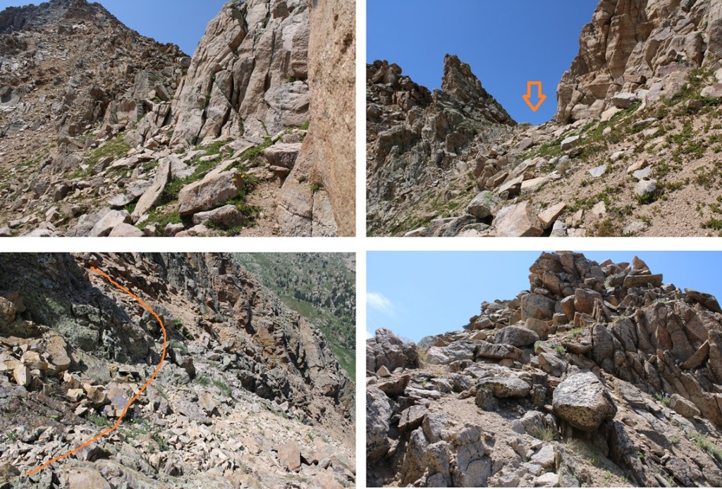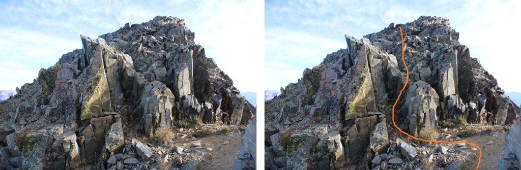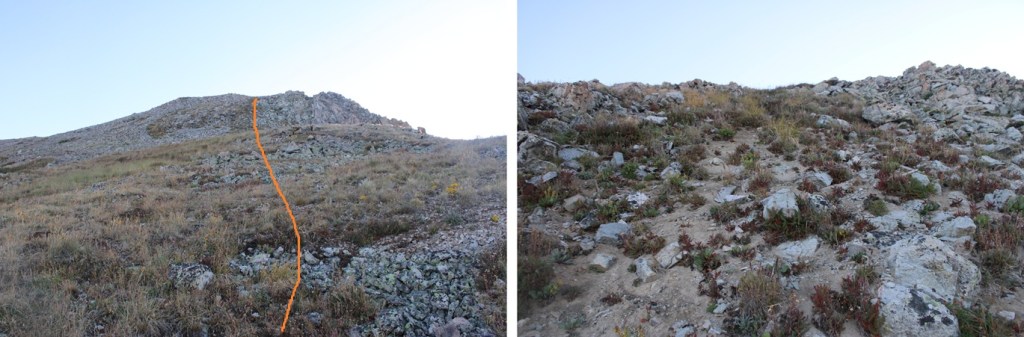 Back on the saddle I’d placed a small cairn where I wanted to descend. There’s also a robust game trail here that’s a good indication of when to descend, just don’t follow it, as it goes in the opposite direction.