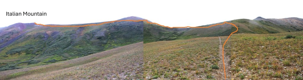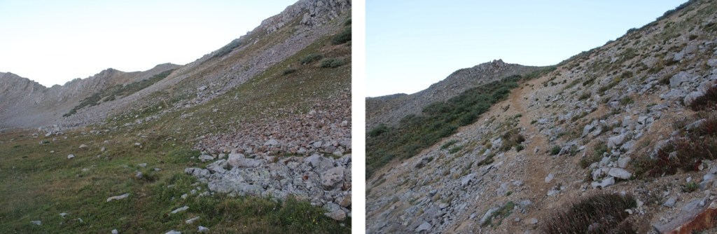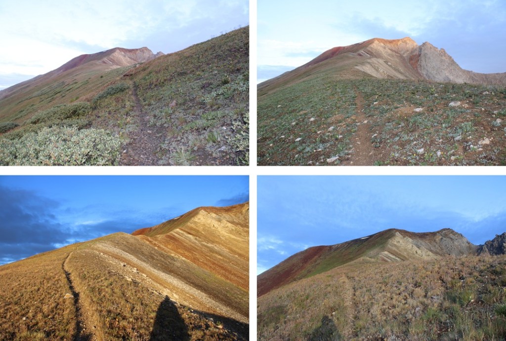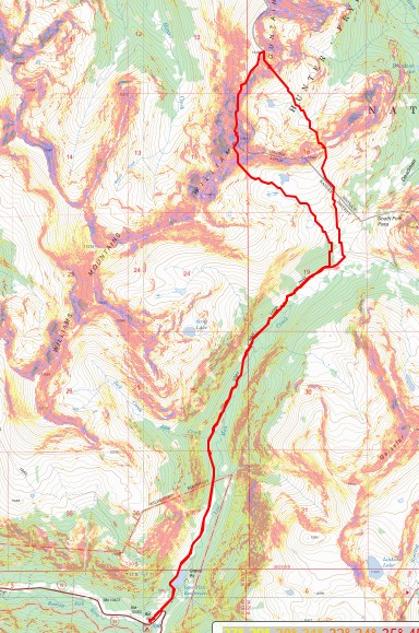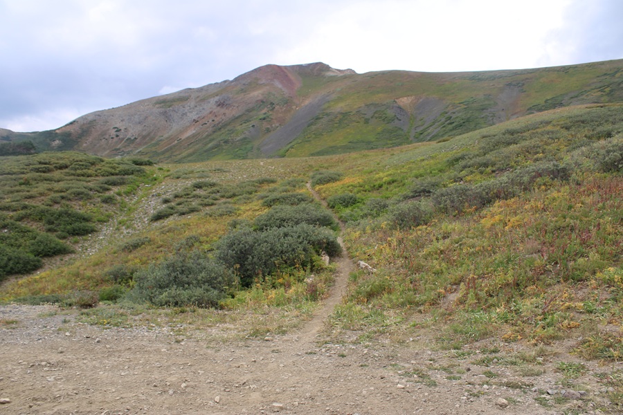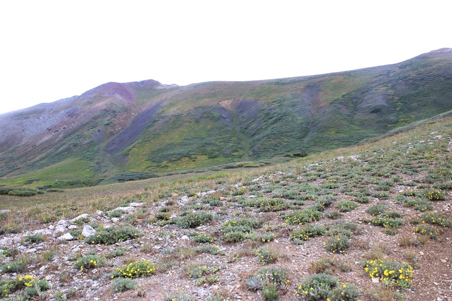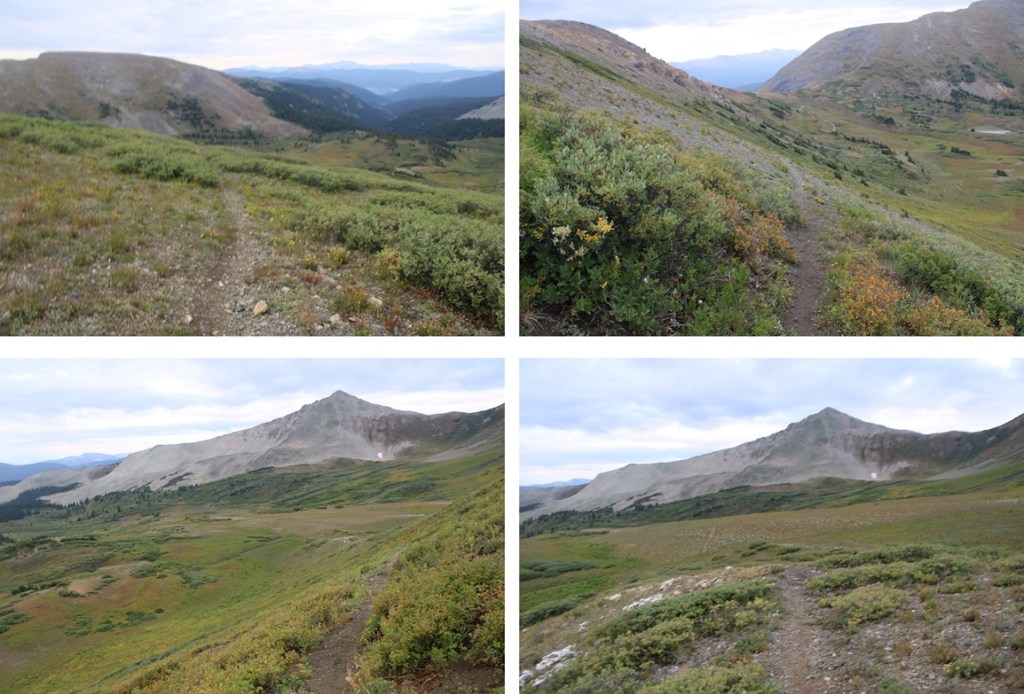 The next morning I was up and on the trail at 7:15am. I found the best way to avoid the willows in the slide area was to stick close to the trees. At the top of the trees I veered right on a game trail and took a tundra grassy hike to the ridge.
