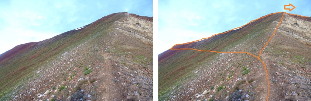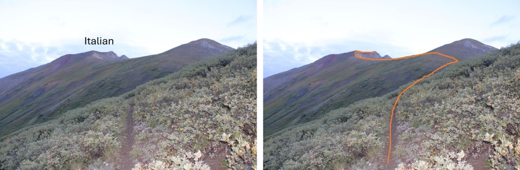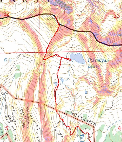 After hiking for 4 miles and at 10930’ of elevation I left the trail and headed east towards an obvious avalanche slide. There are a lot of slides in the area, so look for the one around 4 miles. I was making this an overnight to just enjoy the trek, so I planned to set up my tent at the base of this slide, but if you’re making this a day hike here’s the route I took up to the ridge