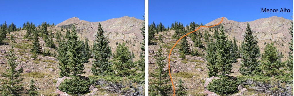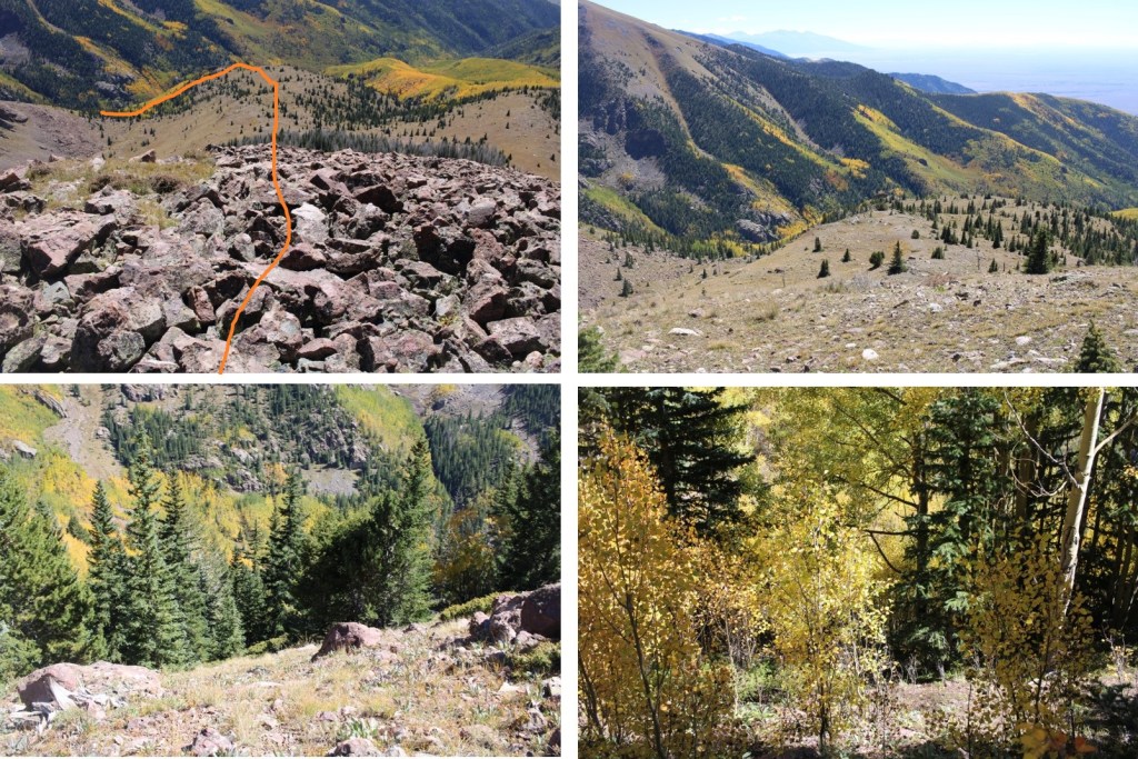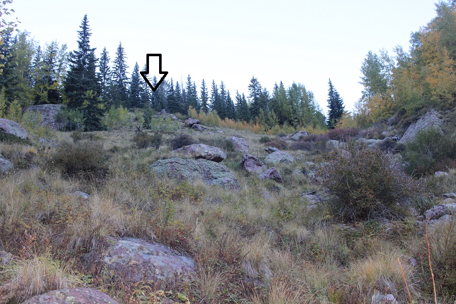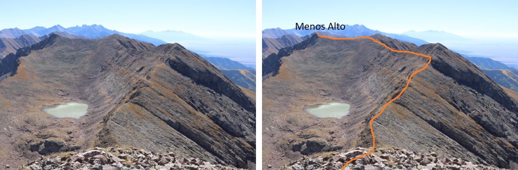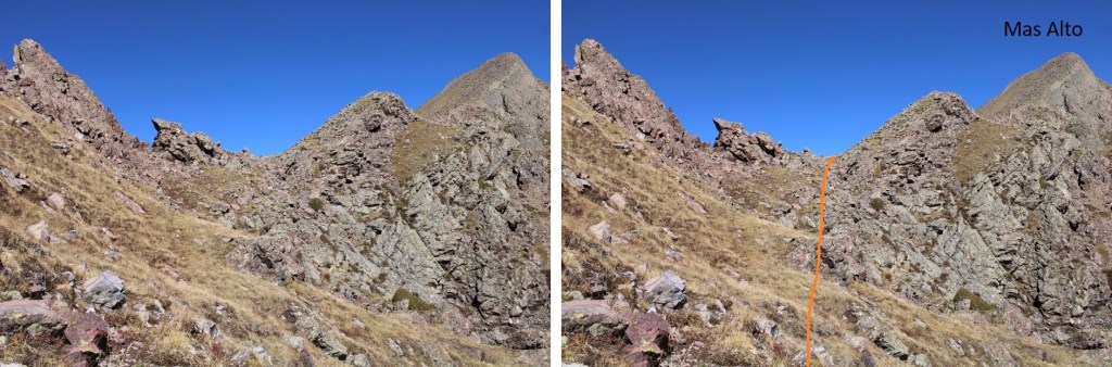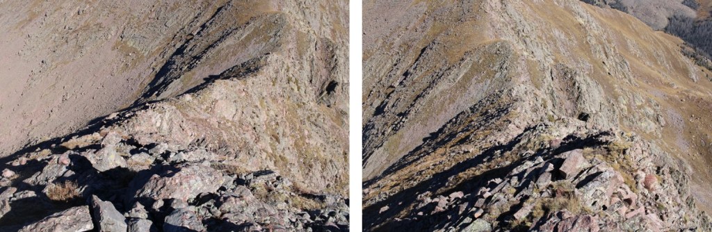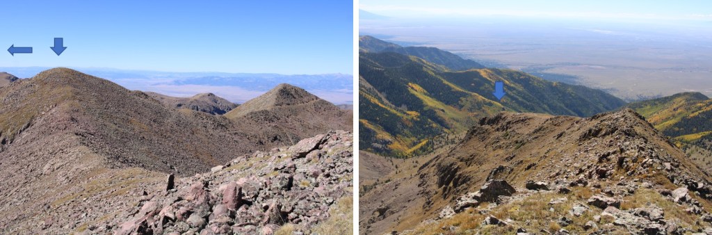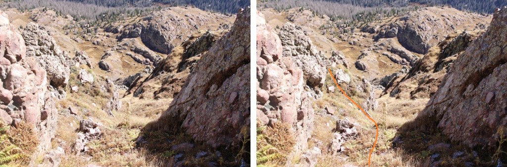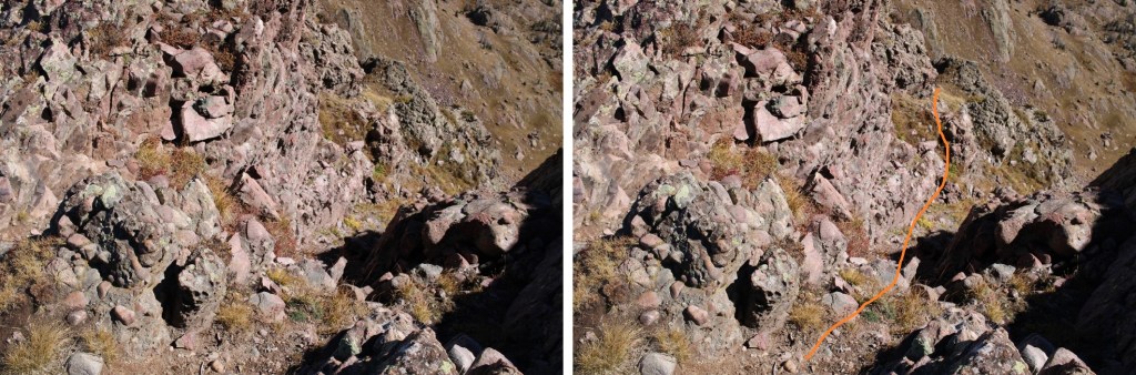 From the saddle look west-southwest and aim for a small notch/gully. You’ll be tempted to stay high, not wanting to lose elevation but trust me, you need to aim for this lower spot. The left picture shows the route looking from above