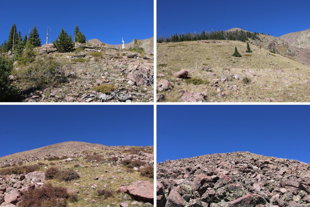 The grass changes to the worst rubble gullies I’ve ever encountered. Scree, sand, rocks, and steep elevation don’t mix. It’s steeper than it looks. I don’t usually sweat while hiking, but today I was. I could feel drops forming and rolling down my sternum. This was a workout!