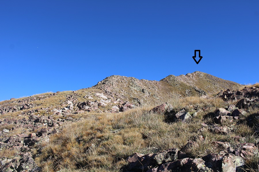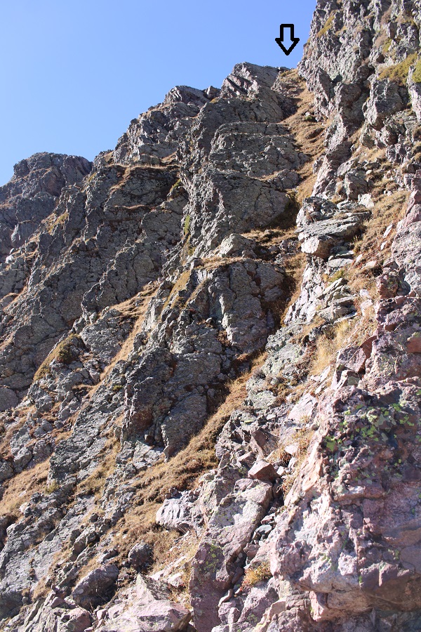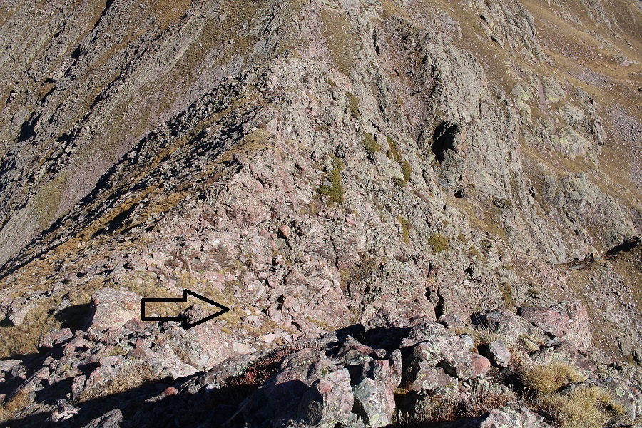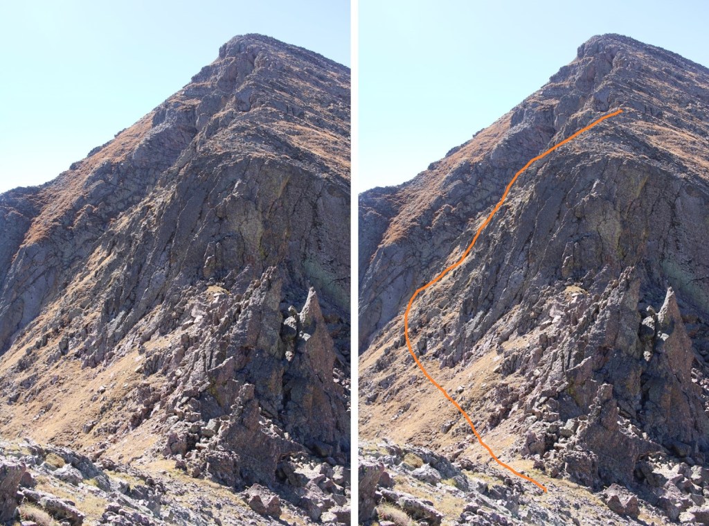 Locate a “thumb” in the side of the mountain. From here aim for the first gully/saddle to your left, being careful to stay as high as possible to avoid dangerous scree