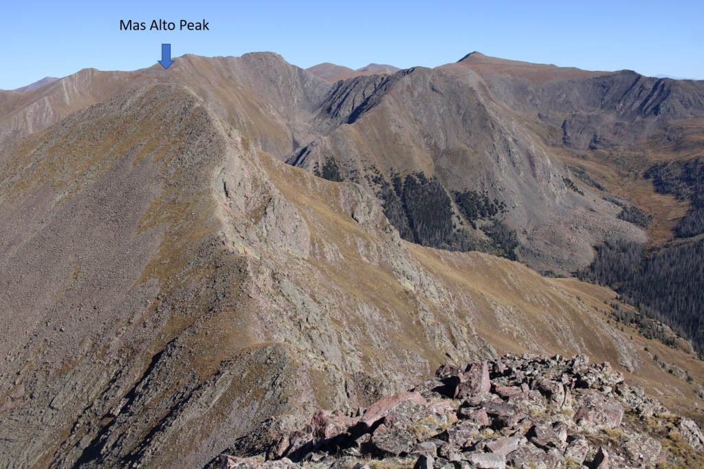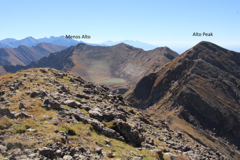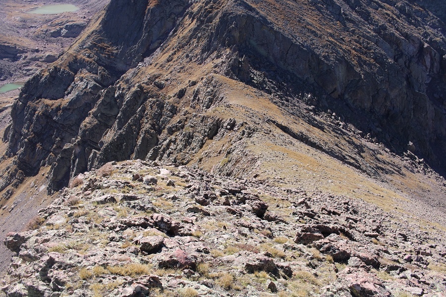 Once there you’ll continue west/southwest and drop in elevation again. Yep, all the way down to this point (12,400’). The terrain here is perilously loose, and one slip can take you sliding dangerously for a long time. Stay high, aim for the rock wall, and follow it down and around. The higher you stay early on the larger and more stable the rocks are.